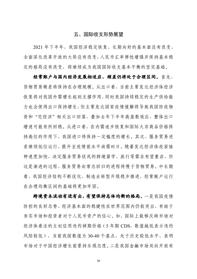 2021 年下半年,全球疫情仍将不断演变,世界经济金融运行中的不稳定不确定因素依然较多。但我国经济基本面长期向好,全面深化改革开放持续推进,人民币汇率弹性增强并保持基本稳定,继续为国际收支平衡奠定坚实基础。预计经常账户顺差仍将处于合理区间,跨境资本流动有望延续有进有出、总体均衡的发展态势。外汇管理部门将更好统筹发展与安全,继续推动外汇领域改革开放,积极服务实体经济发展;不断完善市场化调节机制和跨境资本流动管理,维护外汇市场平稳运行,保持国际收支基本平衡。
