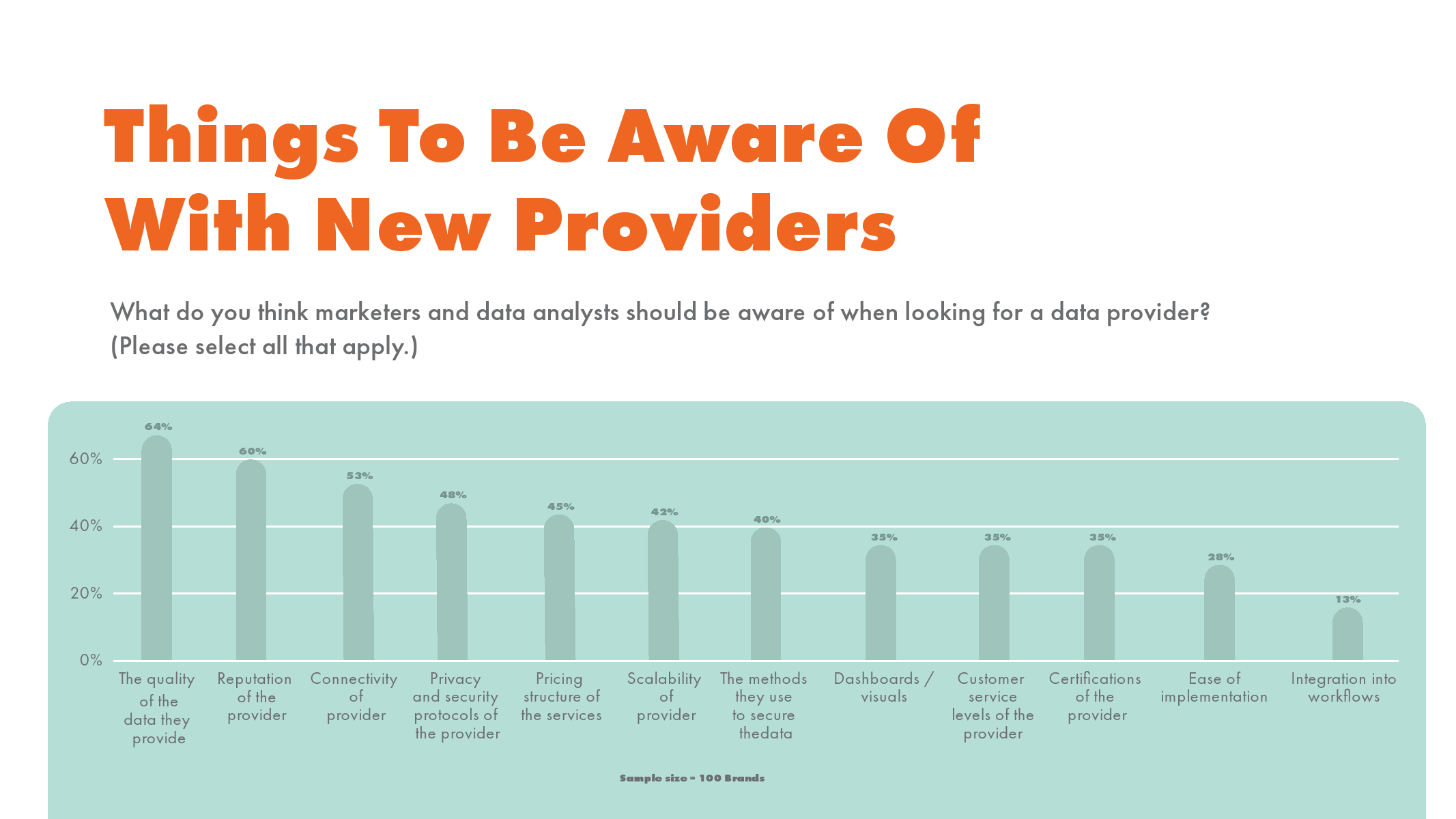 该调查还询问了受访者,在寻找数据提供商时,营销人员和数据分析师应该注意什么。数据质量(64%)和提供商的声誉(60%)在大部分受访者中排名较高。当涉及到数据质量时,受访者在选择新的数据提供者时认为准确性(25%)、及时性(22%)和有效性(18%)在他们的决策过程中是最重要的。
