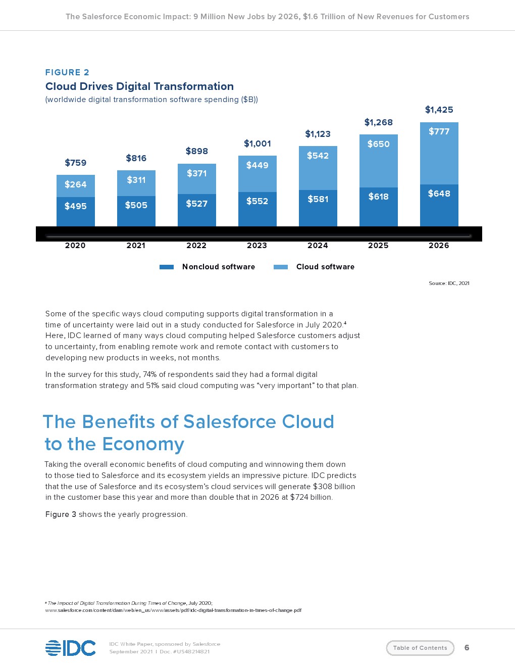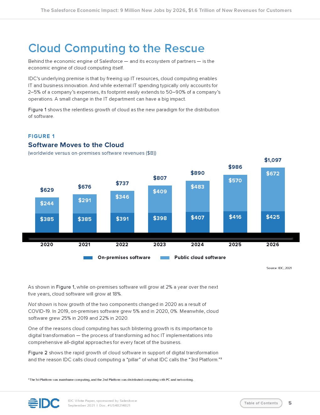 IDC发布了“Salesforce经济影响报告”。云软件的增长几乎没有受到新冠大流行的影响,2020年全球增长了22%,而内部部署软件的增长降至零。今年,云交付软件将占软件市场的43%,到2026年将占61%。