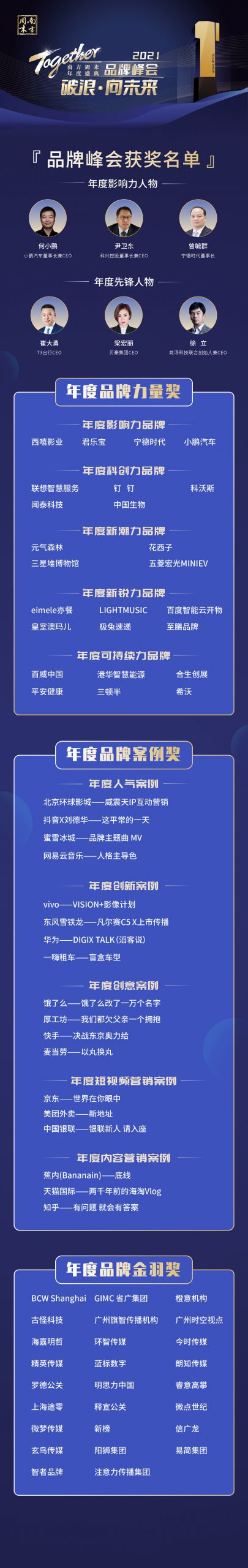 除了精彩纷呈的观点碰撞,每年的奖项发布环节亦是年度盛典品牌峰会的重头戏。今年,峰会面向各大领域及行业,甄选年度具代表性的人物、品牌及案例实践,以此鼓励积极创新的前沿力量。