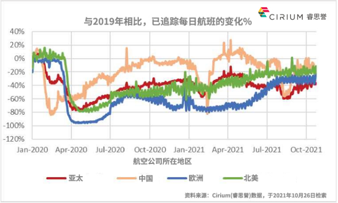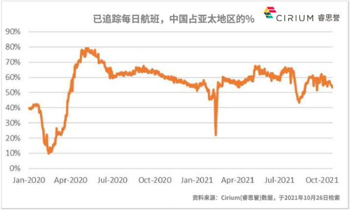 Cirium(睿思誉)的数据显示,2021年,由强劲的国内市场需求提供支撑,中国占亚太地区航空运量将近60%,在第二季度甚至超过了2019年的水平。在该地区其他国家,2021年前9个月的国内航班飞行水平为2019年的56%,而中国的飞行水平为97%。