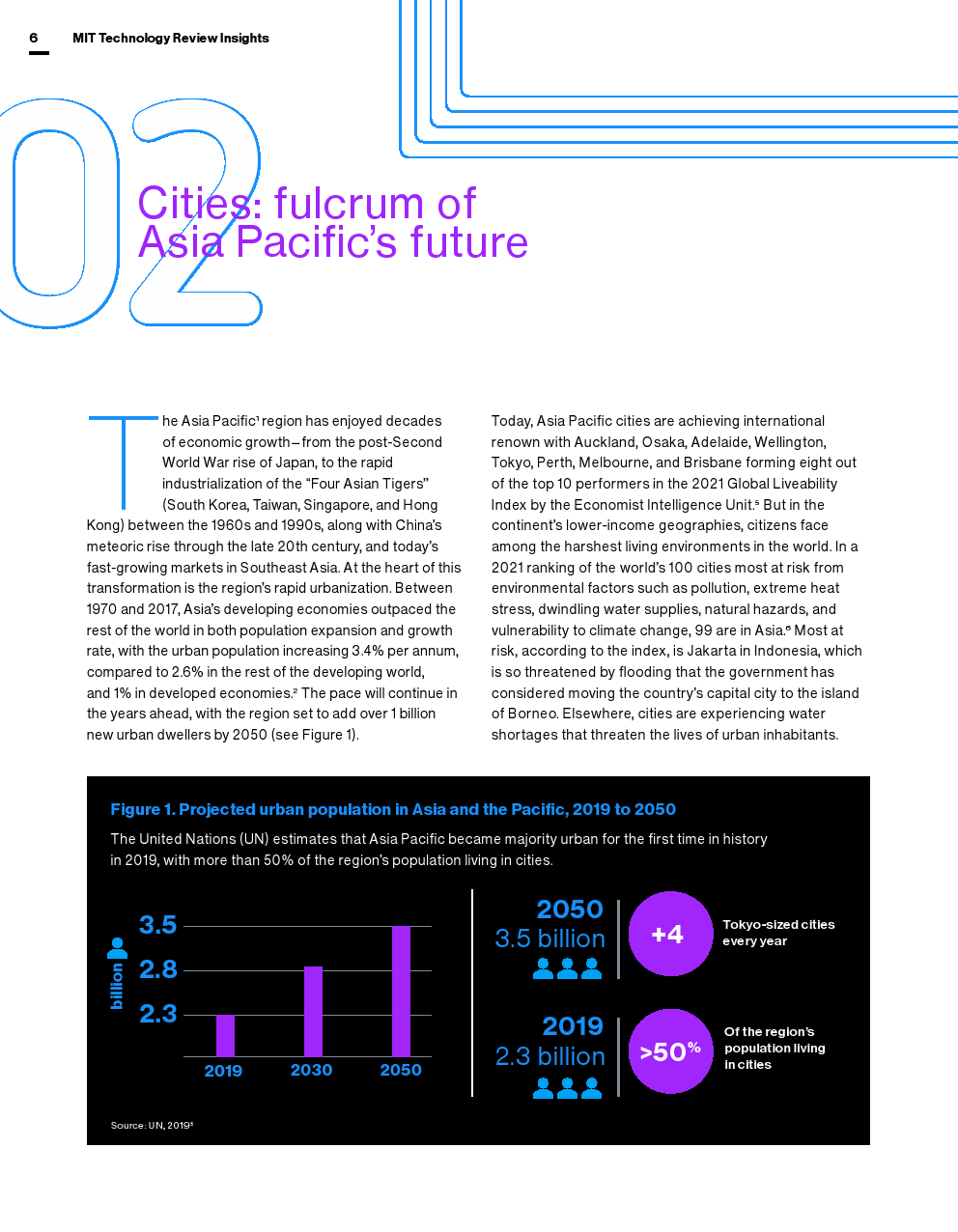领先的亚太城市正在可持续创新方面开辟新天地,为该地区乃至全球同行提供创意。新加坡已成功地从一个生态紧张、人口稠密、缺水、污染和住房不足的城市转变为拥有世界上最好的宜居指标的全球大都市。通过协调一致的规划和政策创新,新加坡提供了一个例子,即面对不利的起步条件如何快速改善可持续性和公民福祉。创新者还使用云计算、人工智能和大数据来实现循环经济供应链、优化交通以及跟踪和应对极端天气。