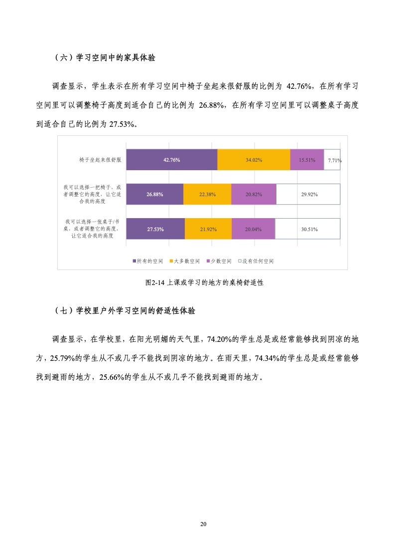学习空间的环境要素包括室温、空气质量、光线、声音、视觉等。从调查结果来看,这些环境要素的质量满足大多数受访学生的舒适性体验。其中在室温上,在外面很冷时,感觉在大多数或全部空间刚刚好的比例超过70%,在外面很热时,感觉在大多数或全部空间刚刚好的比例超过65%;在空气质量上,感觉在大多数或全部空间没有气味的比例超过60%,而感觉有愉快的气味的比例也接近45%;在光线上,感觉在大多数或全部空间刚刚好的比例合计接近80%;在声音上,感觉在大多数或全部空间能清楚听到老师声音的比例超过85%;在视觉上,感觉在大多数或全部空间能轻松看清楚黑板或白板上内容的比例超过80%。
