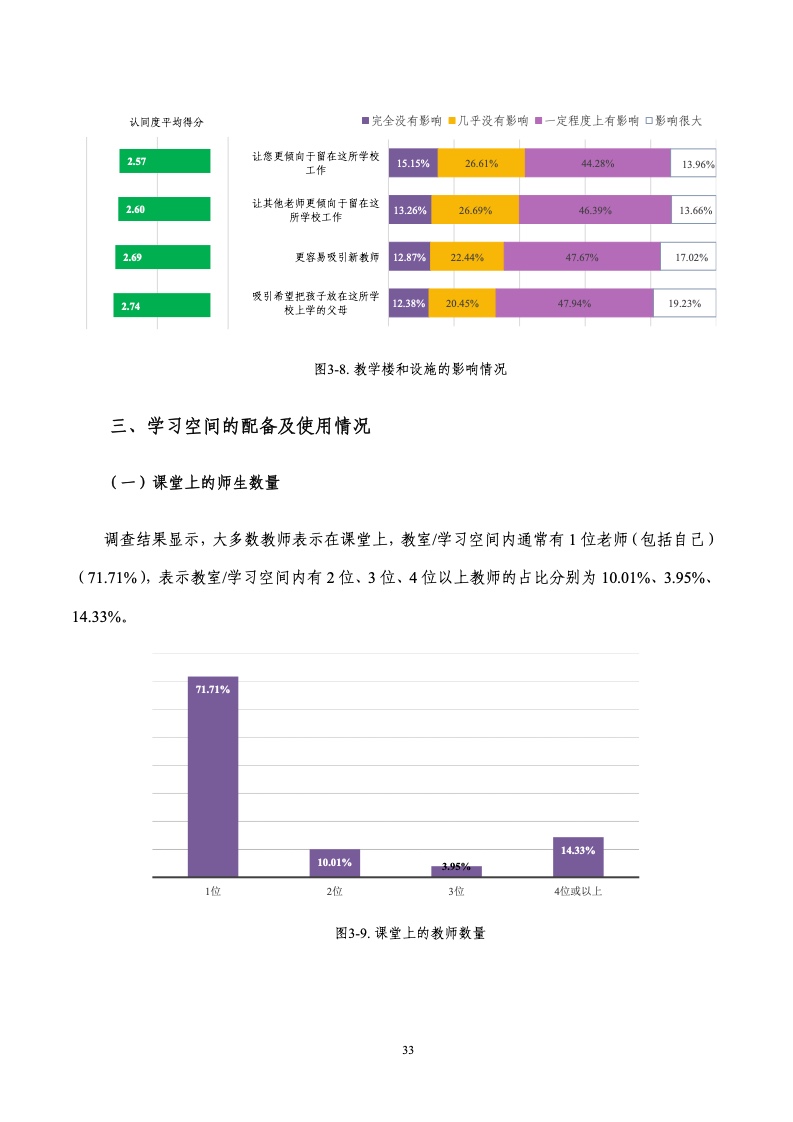 这也就是说,大多数学校的学习空间在舒适性和安全性上差距不是很大,是一种标准化的建设。这一定程度上也解释了为何教师在教学楼和设施对吸引本人或其他教师留在本校、吸引新教师和吸引生源上没有较高的认同度。在本次调查中,教师对这几项的认同度得分为2.5分多一点(1分表示完全没有影响,最高4分表示影响很大),处于“几乎没有影响”和“一定程度上有影响”之间。