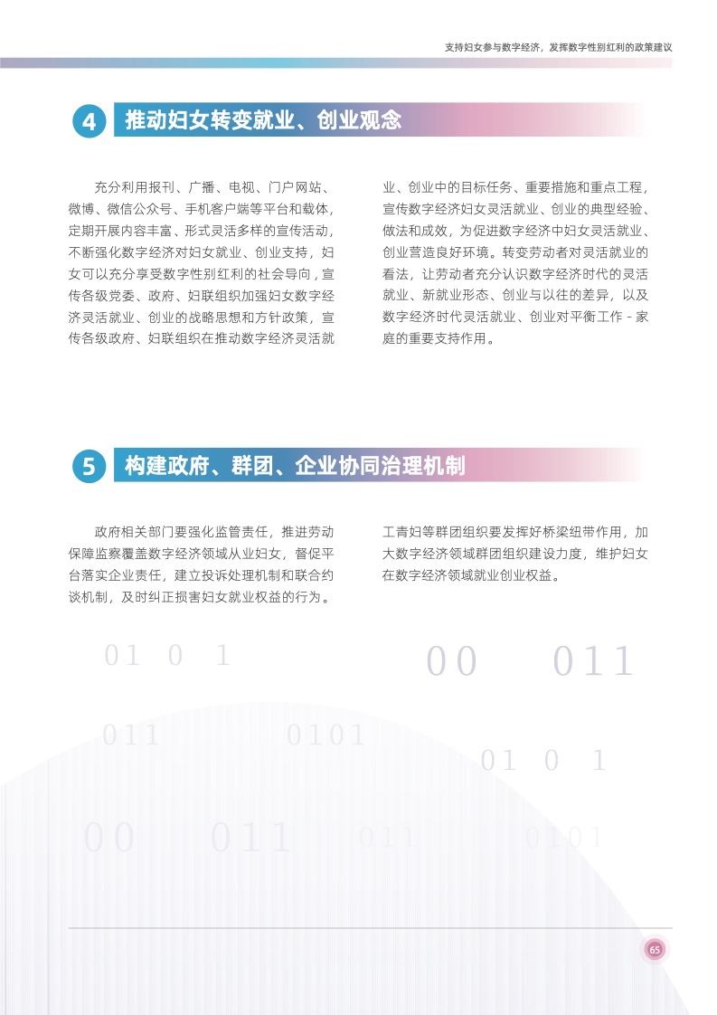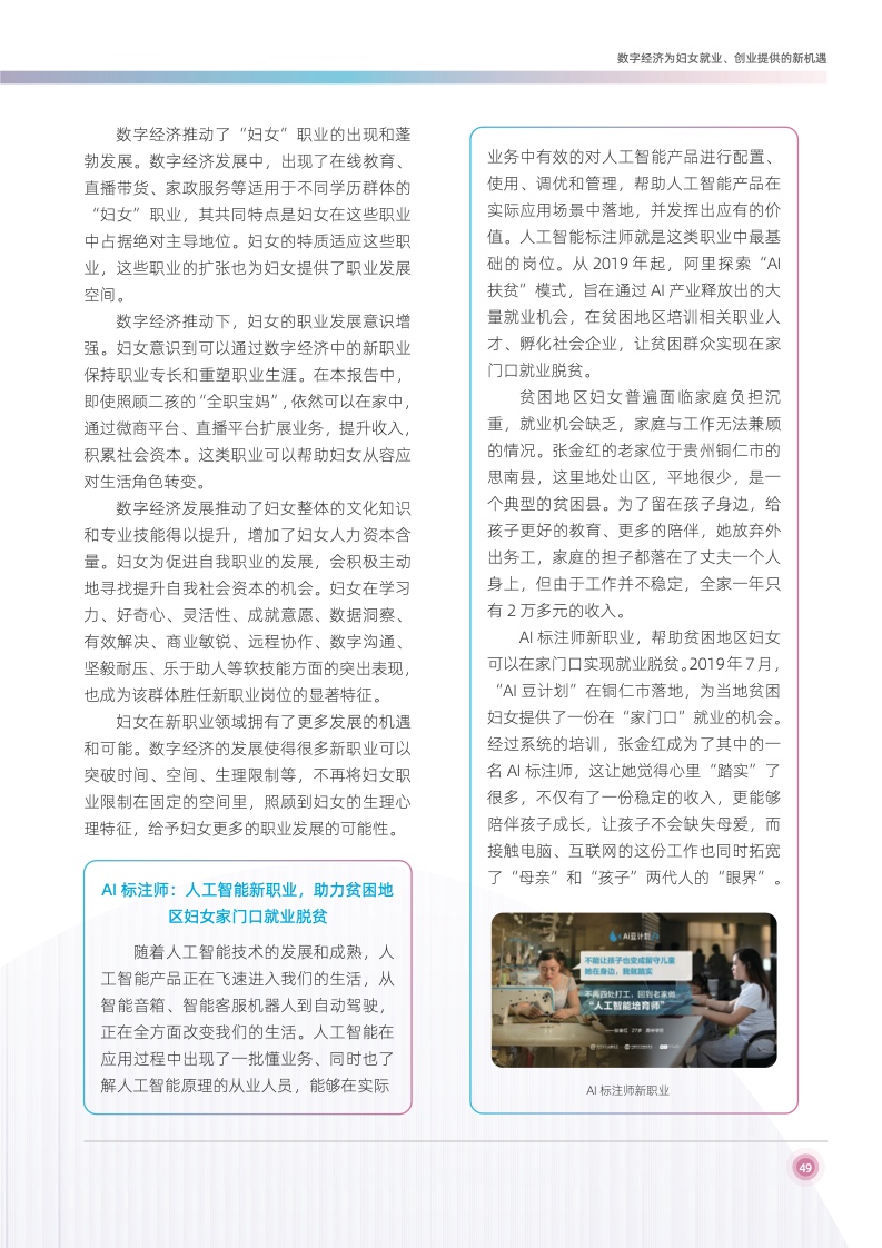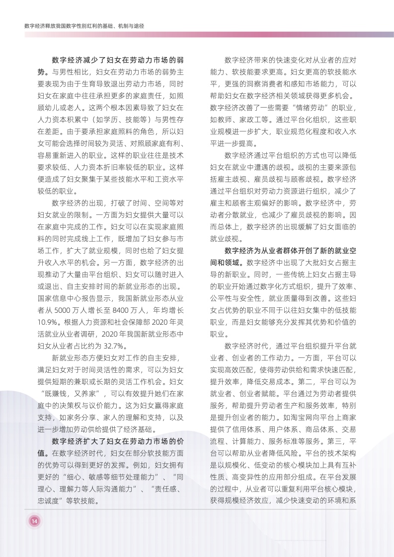 《报告》显示,数字经济的发展提高了女性劳动参与率,拓宽了女性的就业选择面,促进女性创业比重提升,特别是增加了低学历女性的就业规模。