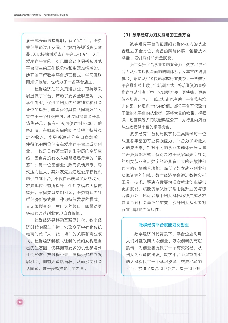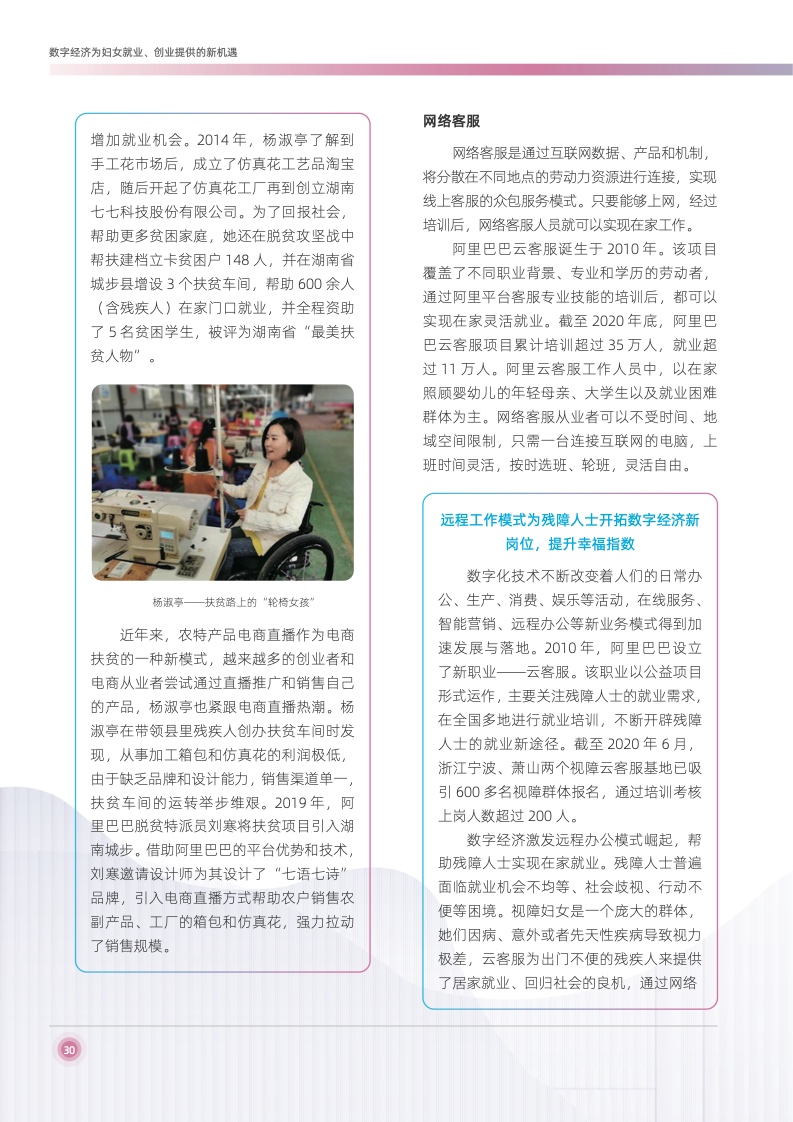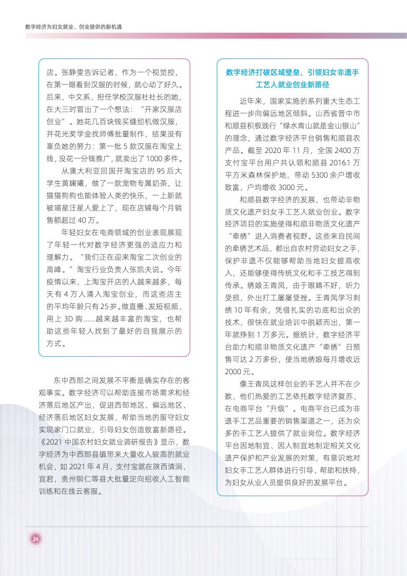 《报告》认为,女性的职业发展是衡量劳动力市场运行质量的重要标尺,也是社会良性运行的重要机制。数字经济为女性创造更多就业、创业机会,缩小城乡女性发展差距,提升女性就业创业质量。通过连接弱势个体与劳动力市场、共享信息与资源,数字经济降低了农村地区、偏远地区女性劳动者的就业创业壁垒。