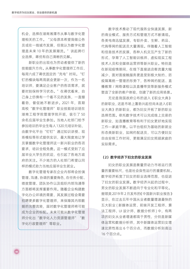 《报告》指出,在数字贸易、电商、直播等领域,数字经济已创造5700万女性就业机会。数字经济创造数字性别红利,扩大了女性在劳动力市场的价值,减少了女性在劳动力市场的弱势,为女性开创了新的就业空间和领域。