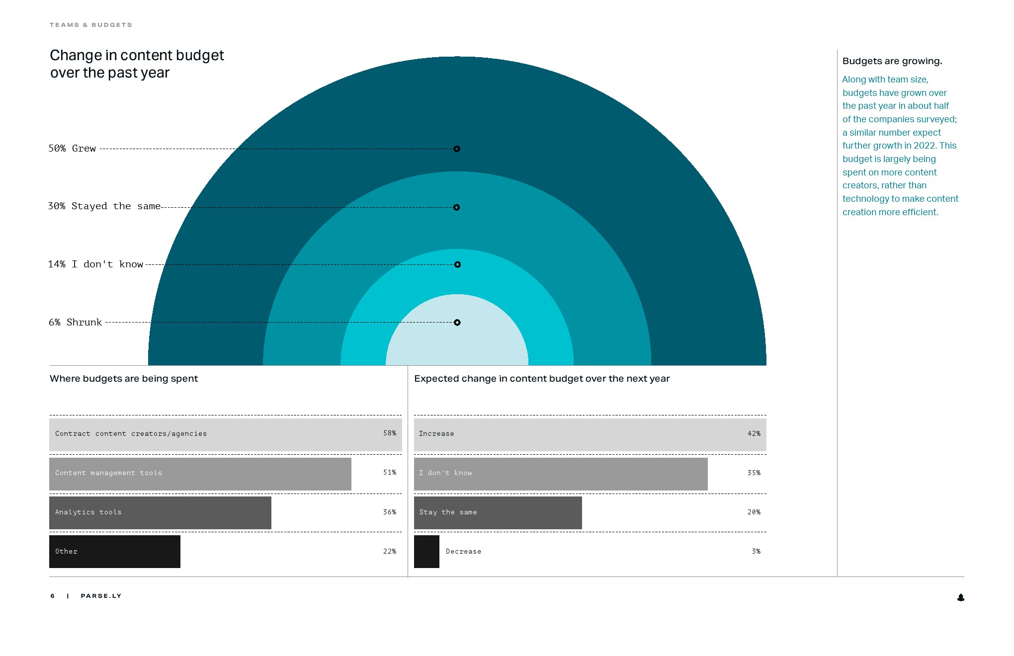 一半的受访者表示他们的内容预算在过去一年有所增长,这些预算更多地用于内容创作者或代理机构(58%),内容管理工具(51%)和分析工具(51%)。