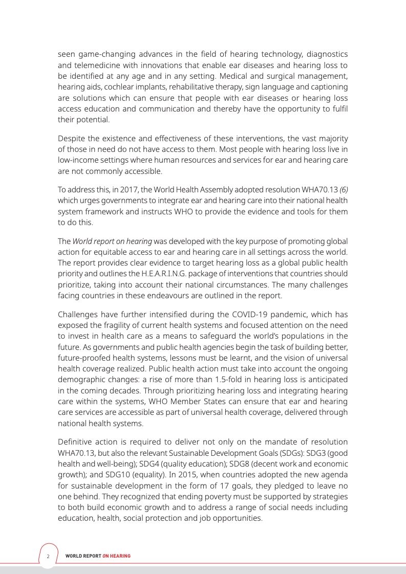 世界卫生组织在报告中写道,创新的、具有成本效益的技术和临床解决方案可以改善大多数听力损失患者的生活质量,且目前已经有数百万人从中受益。将技术力量与公共卫生规划相结合,可以确保所有人受益其中,尤其是那些身处服务水平较低以及偏远地区的人们。