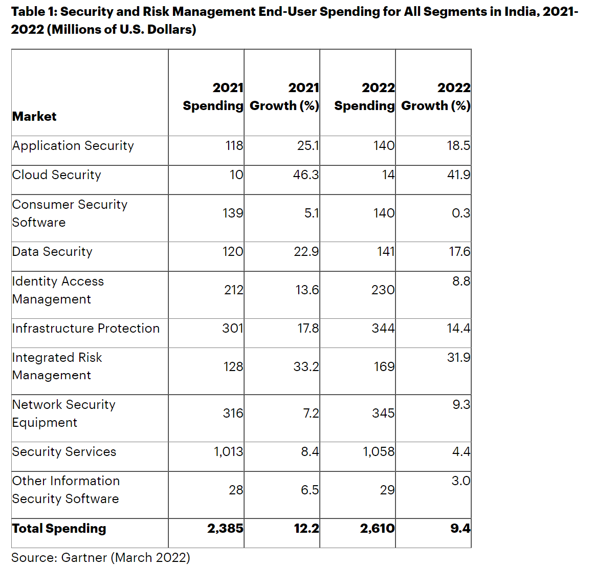根据 Gartner的数据,预计2022年印度用户在安全和风险管理方面的支出总额将达到26亿美元,比2021年增长9.4%。