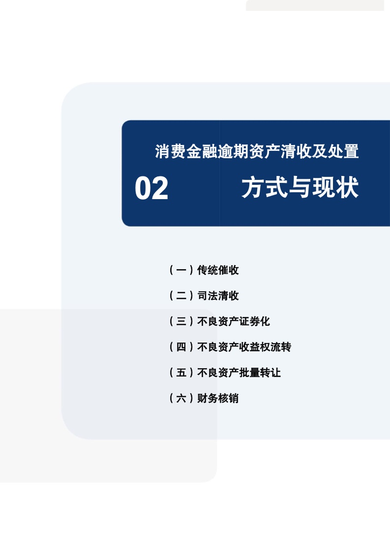 《报告》主要对传统催收、司法催收、批量转让、资产证券化、收益权流转与财务核销展开分析。其中,传统催收和司法催收是早期行业普遍采取的处置方式。近年来,批量转让、资产证券化的关注度显著提升。