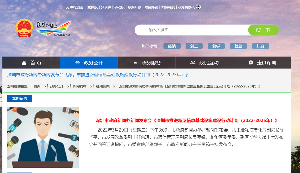 深圳政府在线消息,深圳市工业和信息化局副局长陈华平在今日召开的深圳市推进新型信息基础设施建设行动计划(2022-2025年)政策解读新闻发布会上披露,深圳将全面推动宽带网络提速扩面,实施千兆光网普及和百万用户全面提速计划。