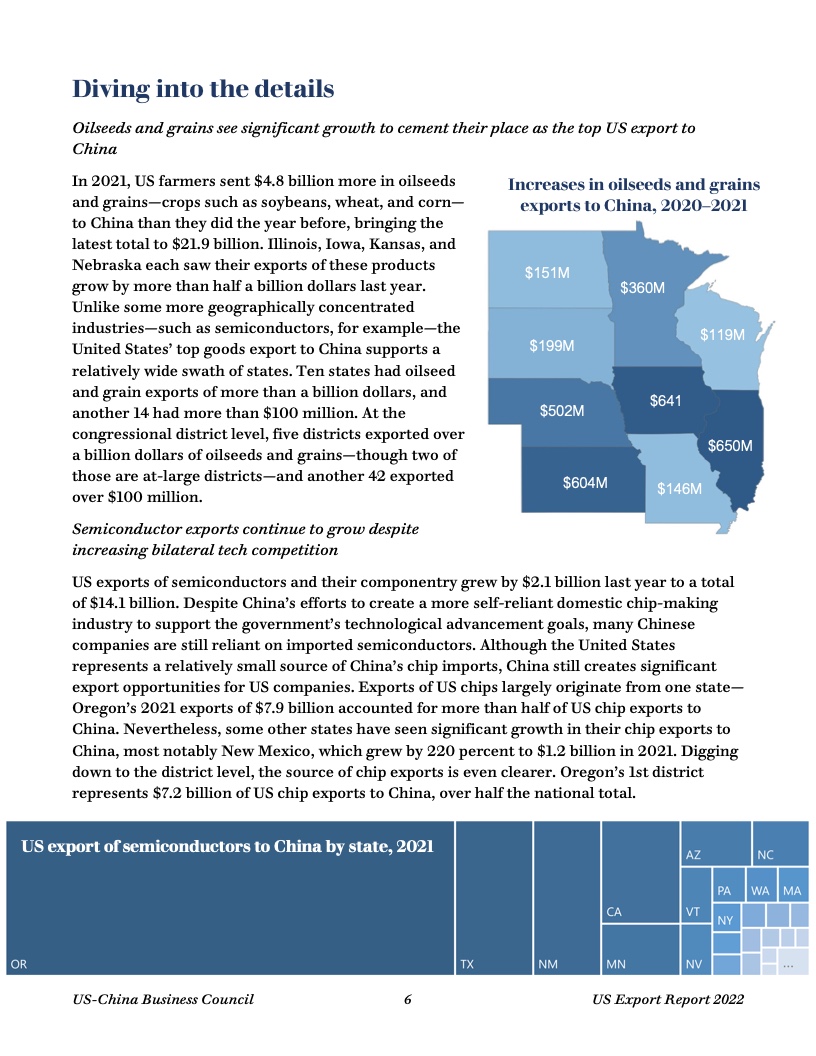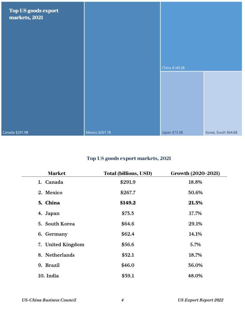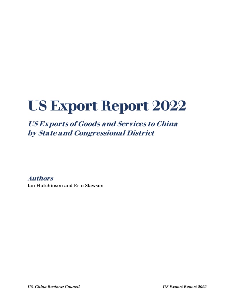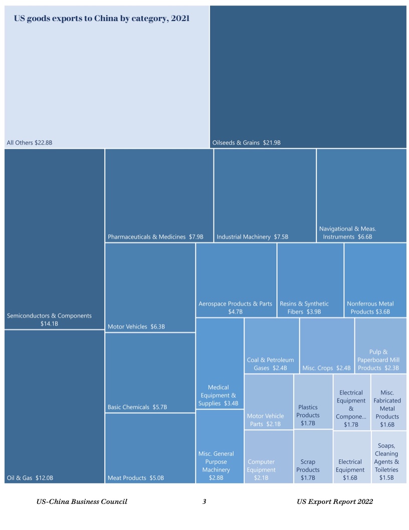 报告显示,去年美国50个州均对华出口,主要出口商品包括油籽、谷物、猪肉和其他农产品,以及石油和天然气、半导体、医药产品等。中国继续保持美国第三大货物出口市场地位。