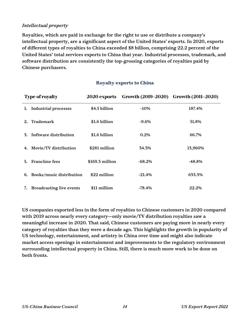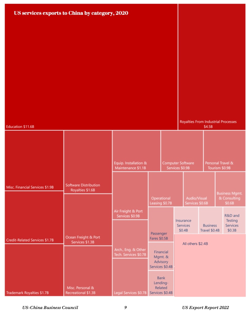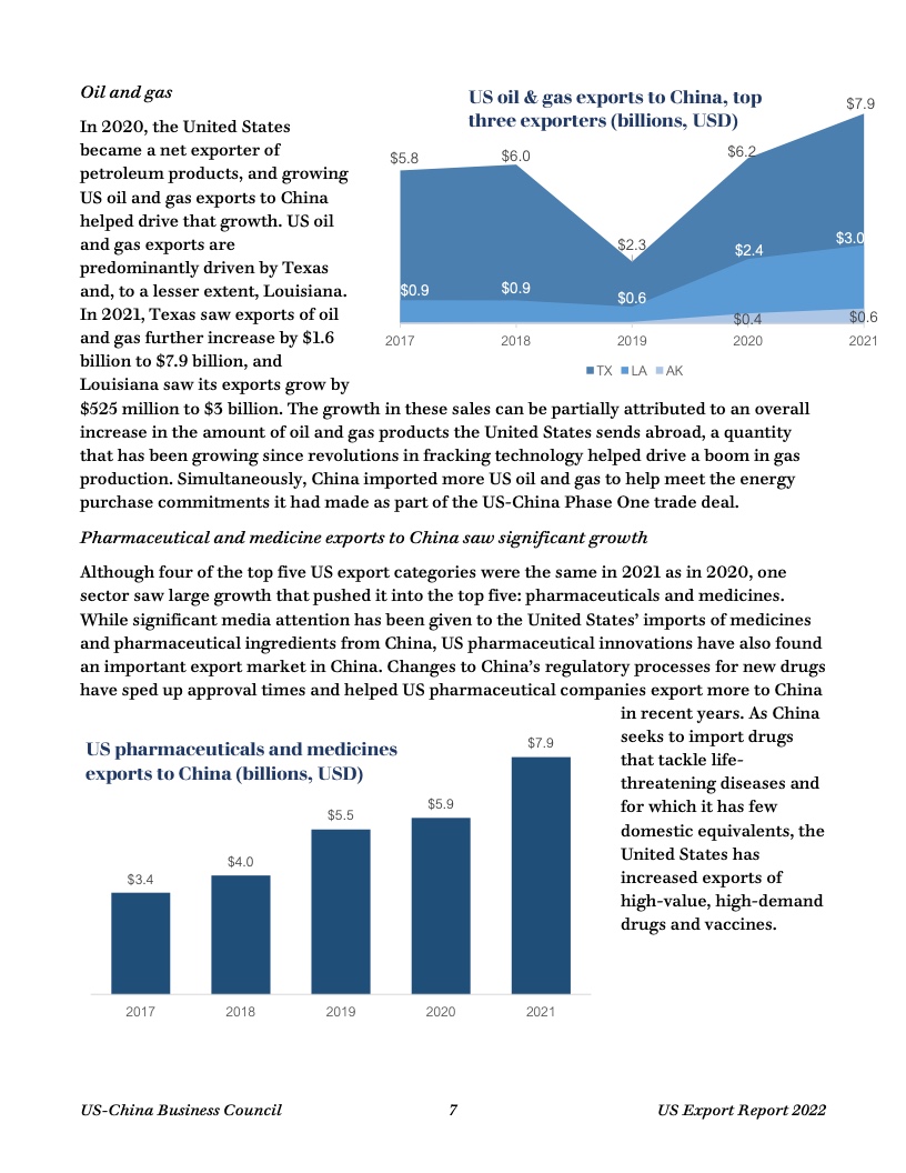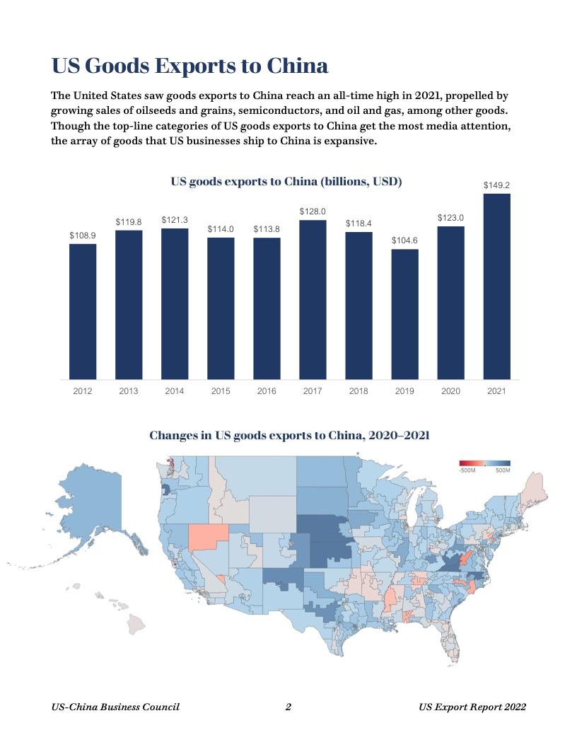 报告显示,去年美国50个州均对华出口,主要出口商品包括油籽、谷物、猪肉和其他农产品,以及石油和天然气、半导体、医药产品等。中国继续保持美国第三大货物出口市场地位。