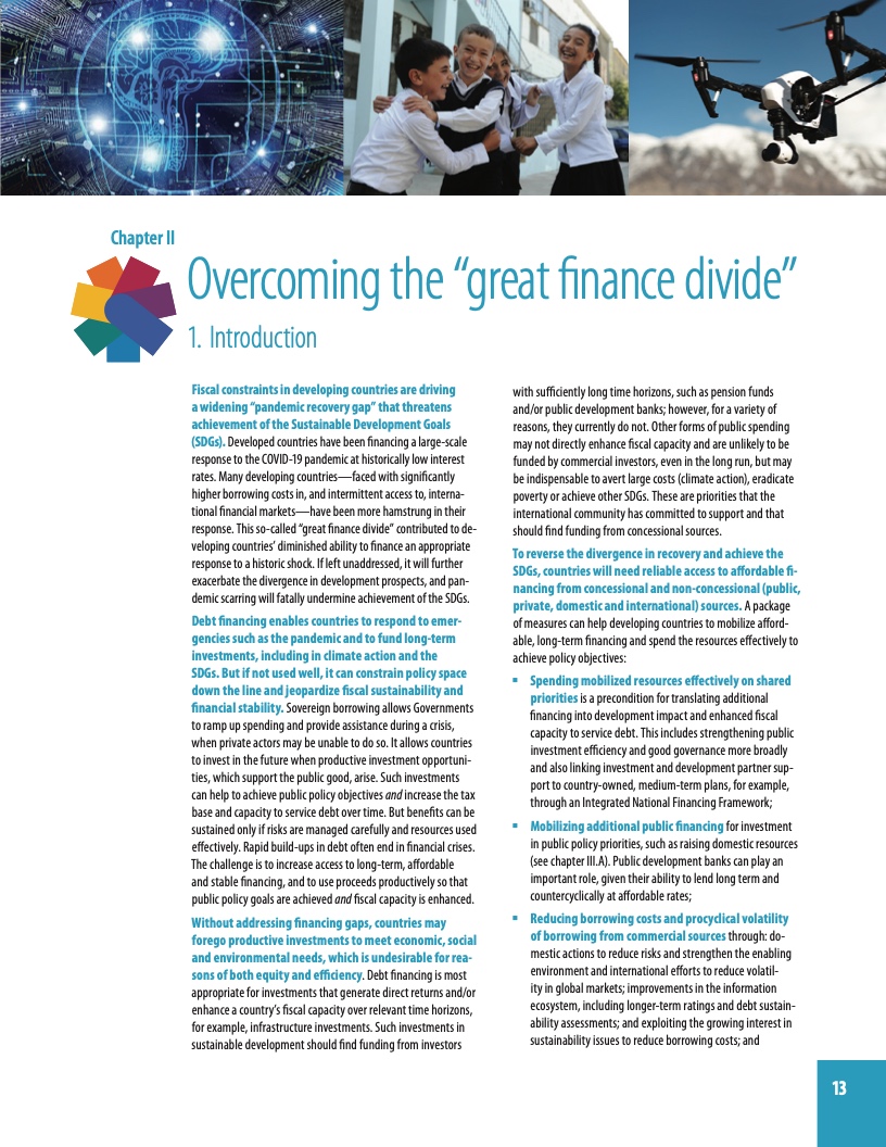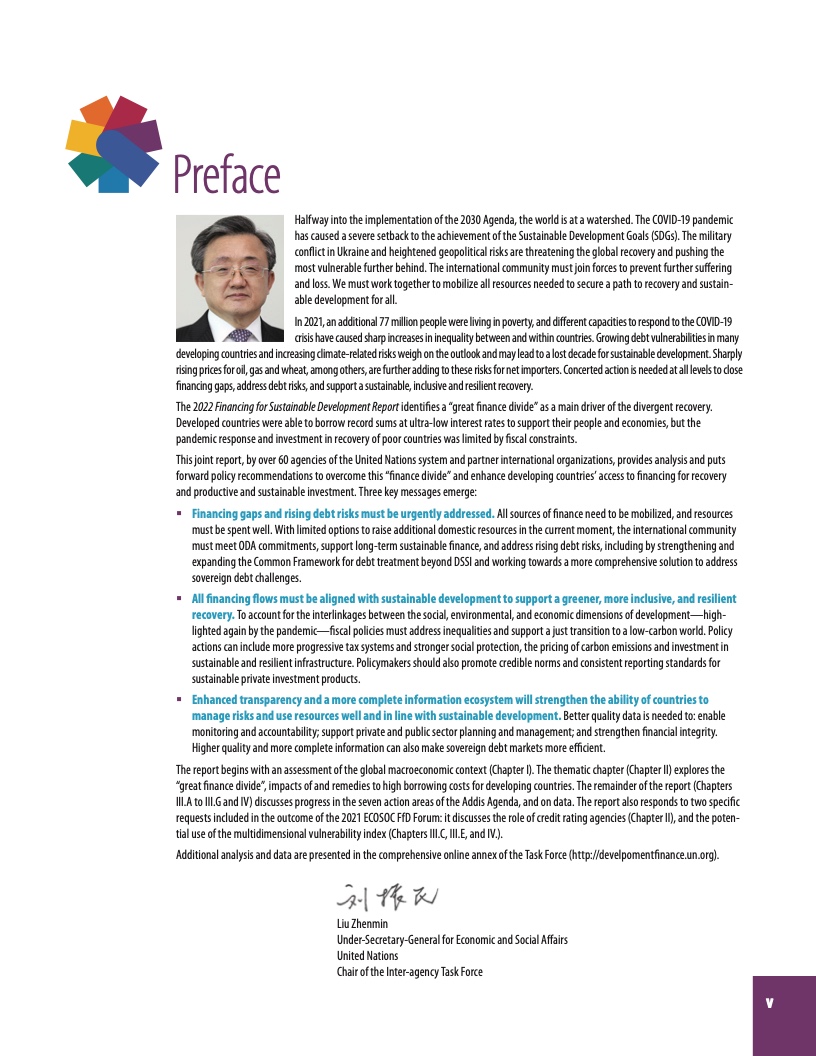 《弥合融资鸿沟》报告建议在三个领域采取行动: 迫切解决融资缺口和不断上升的债务风险;确保所有资金流动与可持续发展保持一致;提高透明度和更完整的信息生态系统,以加强各国管理风险和妥善利用资源的能力。