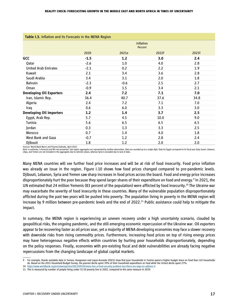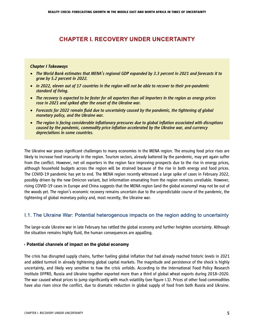 世行最新一期经济简报《现实核验:不确定性时代中东与北非地区增速预测》预计,由于本地区国家平均增速存在很大差异,各国经济复苏将不均衡。石油生产国将受益于更高的油价和疫苗接种率,而脆弱国家将落在后面。更为紧缩的全球货币政策、疫情进程的不可预测性、持续的供应链扰乱以及食品价格飙升增大了整个地区的通胀风险。