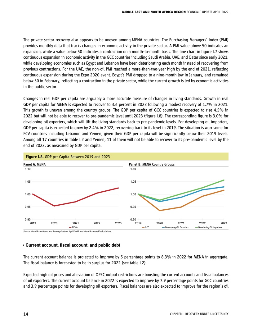 报告称,尽管本地区预测增长率将达5.2%,但人均GDP(衡量民众生活水平的一项指标)将很难超过疫前水平,因2020-2021年的总体表现平平。受油价上涨支撑,海湾合作委员会成员国2022年人均GDP预计将增长4.5%,但在2023年之前不会恢复到疫前水平。对照而言,2022年本地区中等收入石油出口国的人均GDP预计将增长3.0%,石油进口国将增长2.4%,这两个增幅都很难把民众生活水平提高到疫前水平之上。总体而言, 如果上述预测成真,本地区17个经济体中的11个在2022年底之前可能无法恢复到疫前水平。