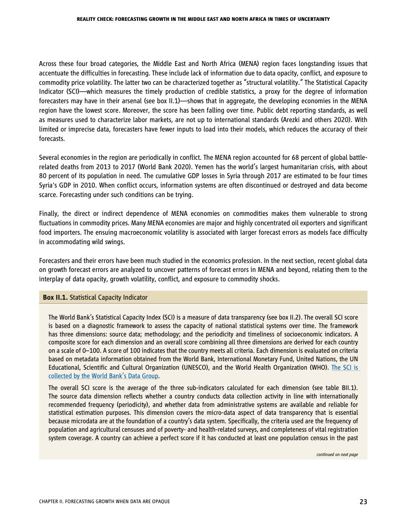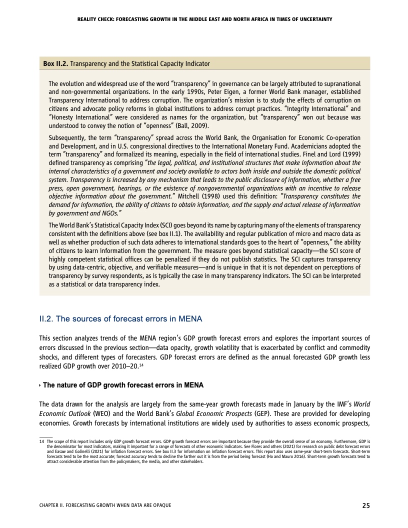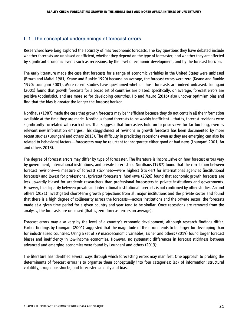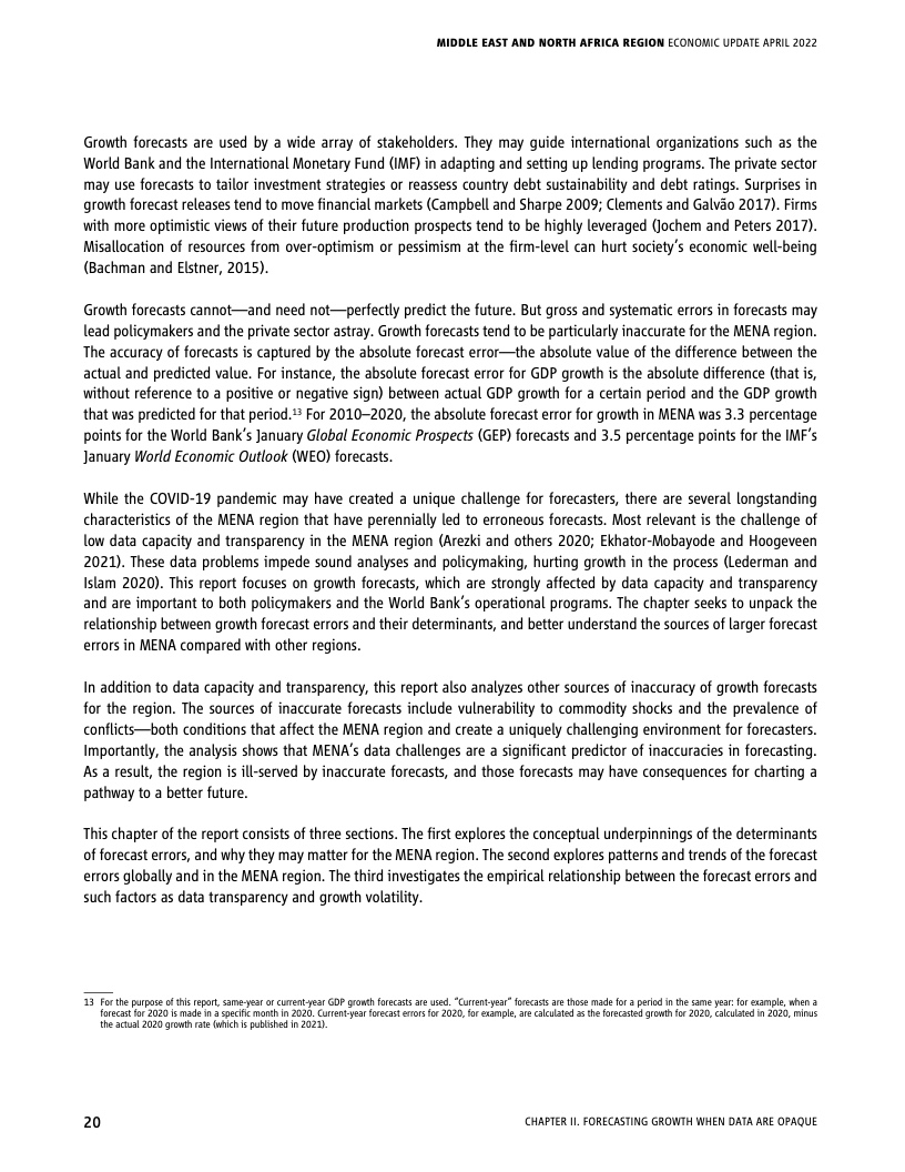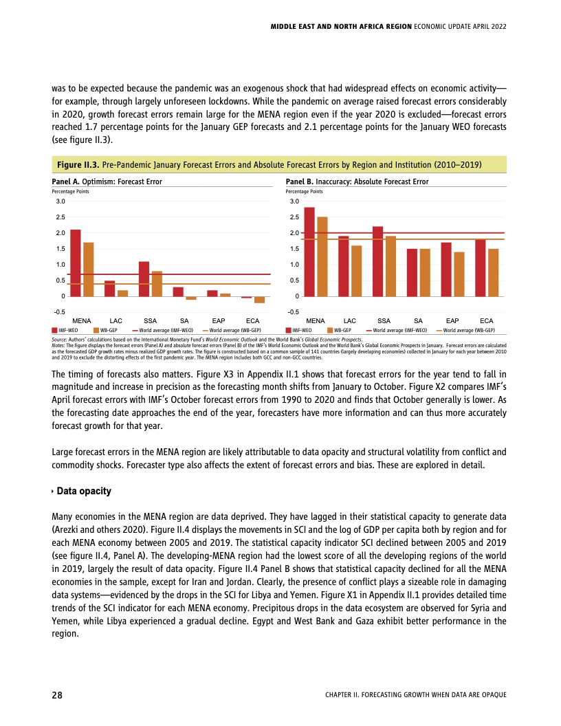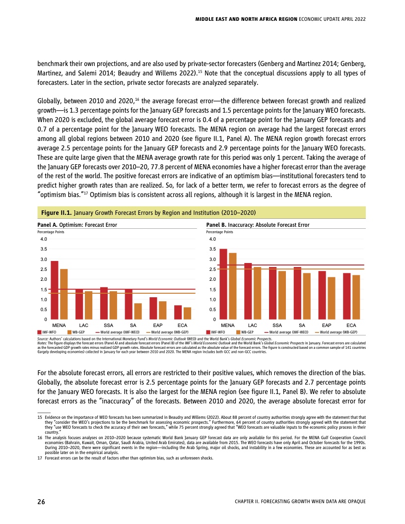 每一期《中东和北非经济简报》都突出了一个特别令人感兴趣的方面。本期简报对过去十年来的增长预测进行了现实核验,经济预测是各国政府准备未来发展的有用工具,特别是在充满不确定的时代。作者认为,与其他地区的增长预测相比,该地区过去十年的增长预测普遍不准确,过于乐观。过于乐观的预测可能导致未来经济增长放缓。造成预测不确定性的一个主要因素是信息的质量、及时性和可获得性,而该区域落后于其他发展中区域。