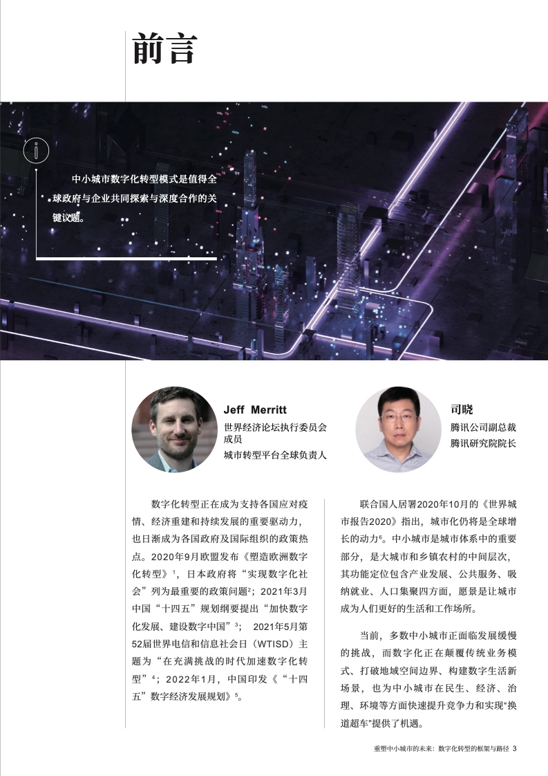 《重塑中小城市的未来:数字化转型的框架与路径》(以下简称报告)洞察力报告于2022年5月9日正式发布,这是世界经济论坛联合腾讯研究院历经10个月的研究成果,也是世界经济论坛以及G20全球智慧城市联盟首次关注全球中小城市的数字化转型话题。