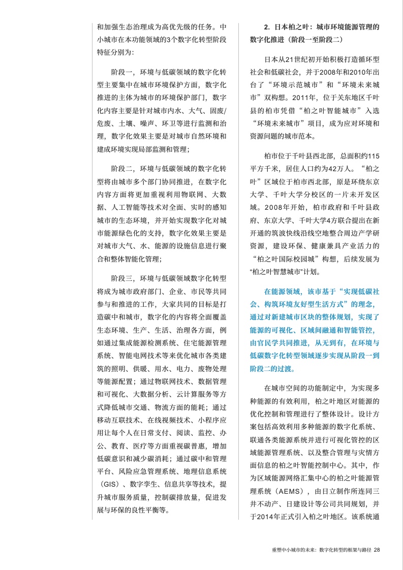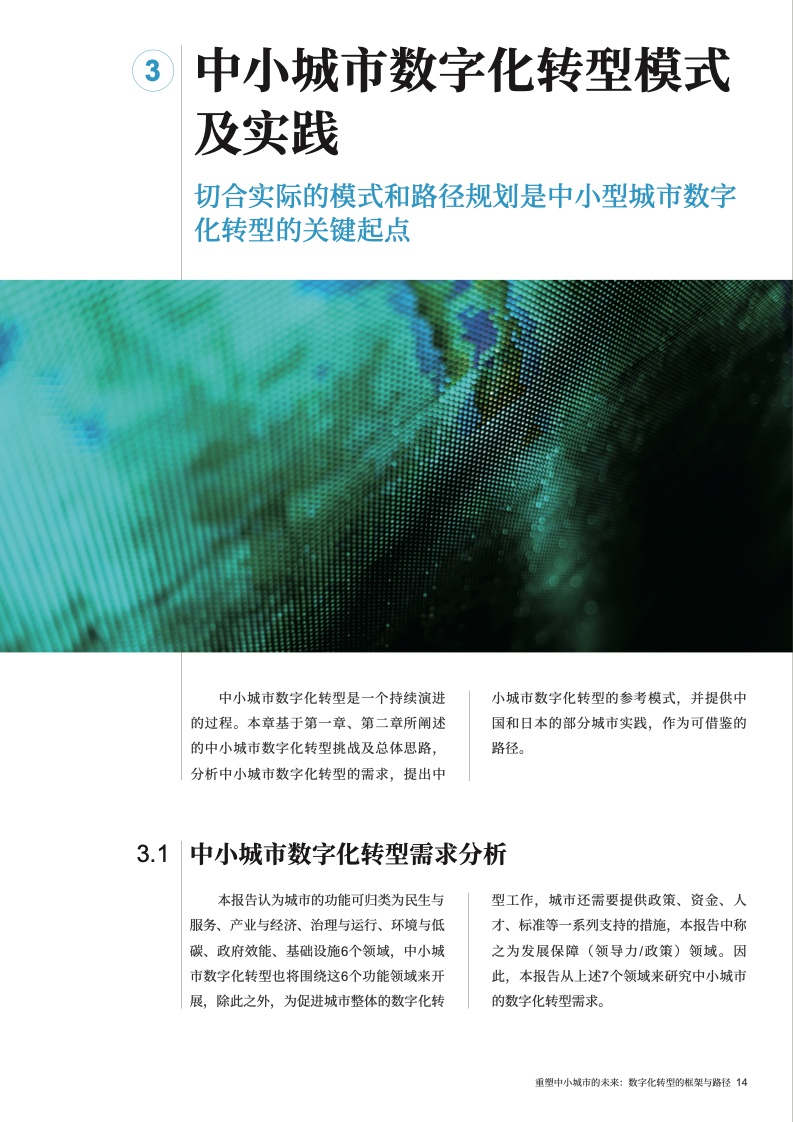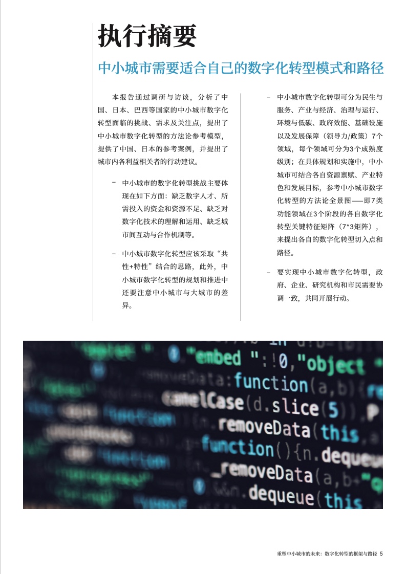 报告通过调研与访谈,分析了中国、日本、巴西等国家的中小城市数字化转型面临的挑战、需求及关注点,提出了中小城市数字化转型的方法论参考模型,提供了中国、日本的参考案例,并提出了城市内各利益相关者的行动建议。