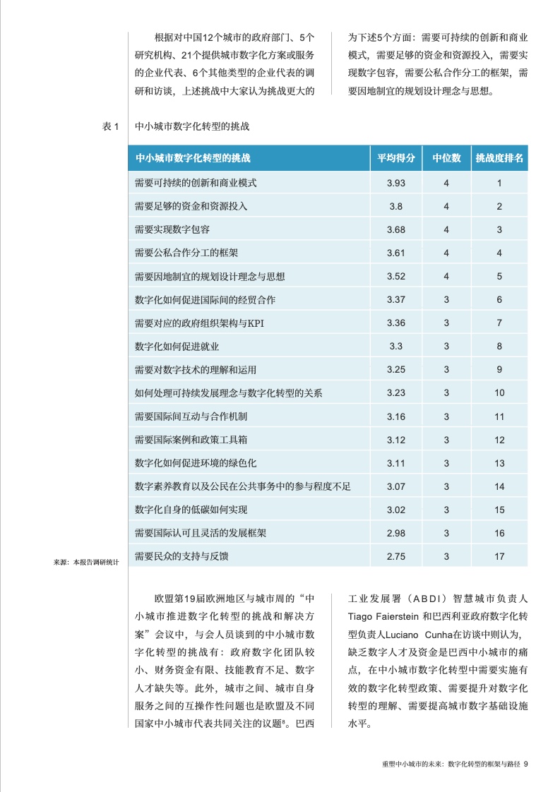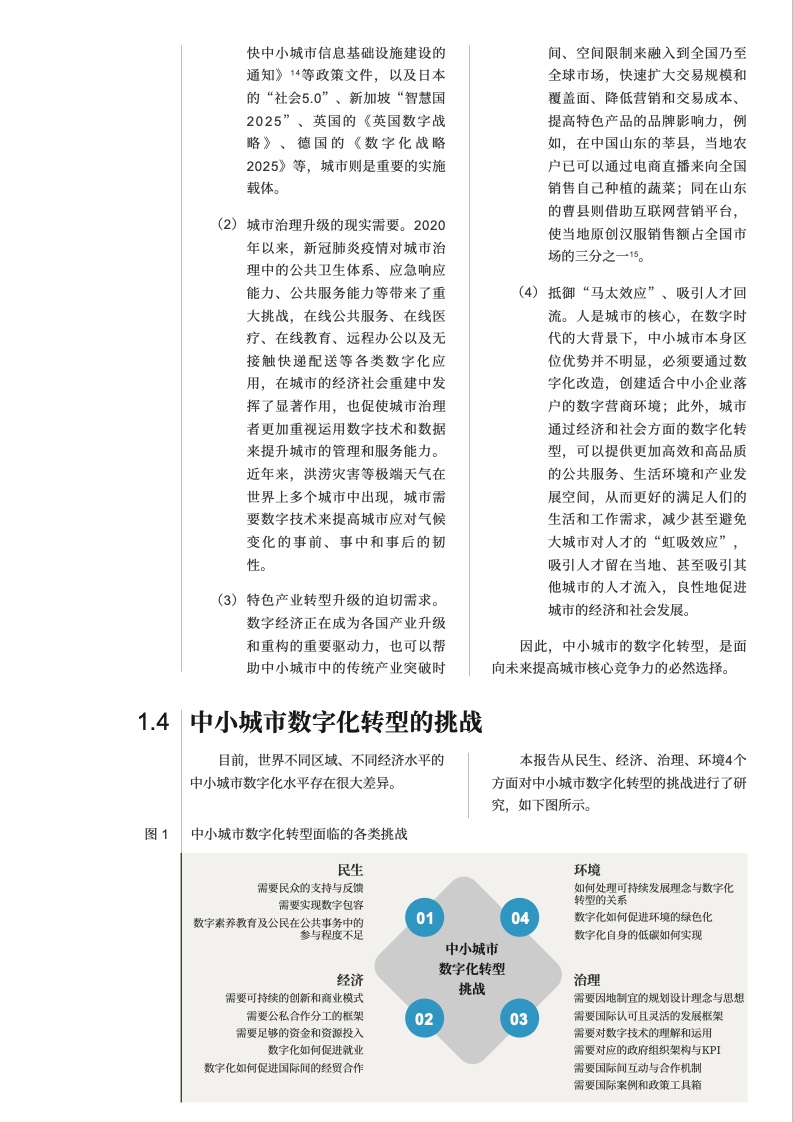 – 中小城市的数字化转型挑战主要体现在如下方面:缺乏数字人才、所需投入的资金和资源不足、缺乏对数字化技术的理解和运用、缺乏城市间互动与合作机制等。