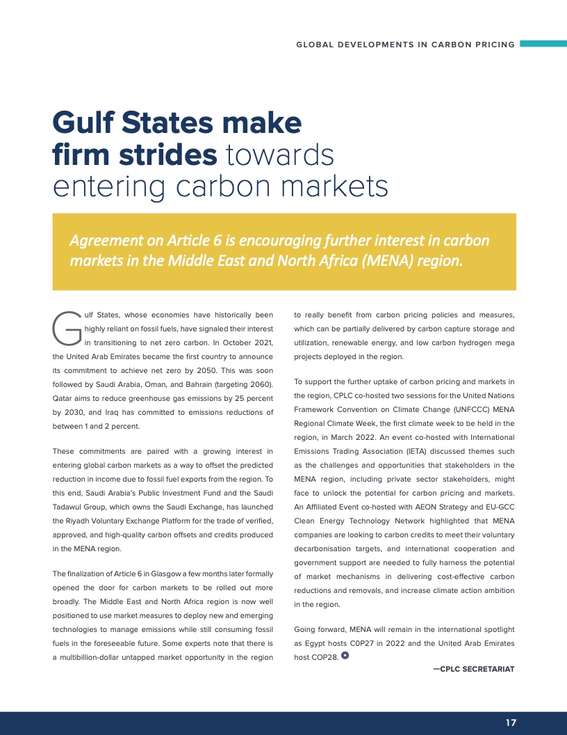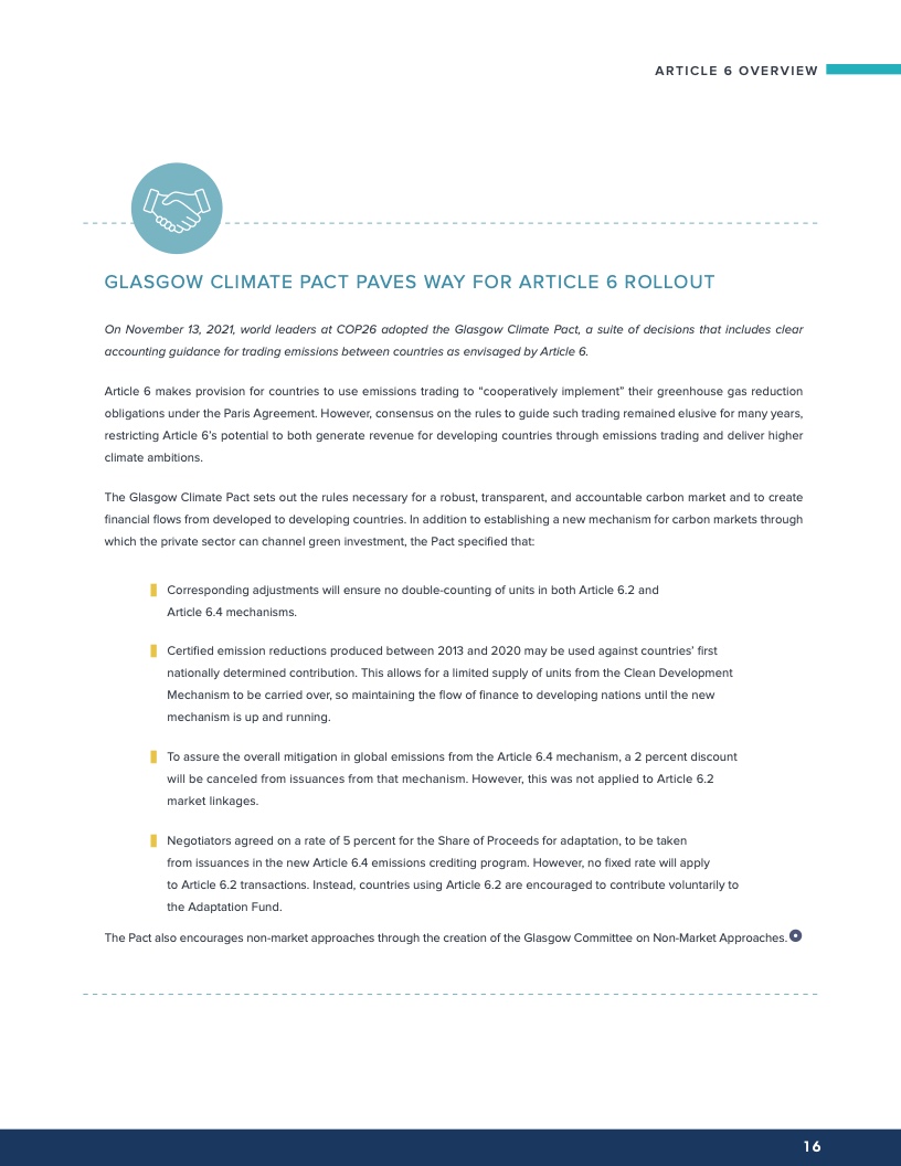 经过6年的谈判,第26届联合国格拉斯哥气候变化会议(COP26)最终通过了一项《巴黎协定》第六条通过碳市场开展国际合作的实施细则。这为各国避免重复计算、保护环境的完整性提供了工具,为私人资本流入发展中国家铺平了道路。执行规则的完成为碳市场打开了大门。随着越来越多的企业和政府通过利用碳市场价格、刺激气候行动来实现到本世纪中叶实现净零排放的长期目标,世界有望看到果断行动。