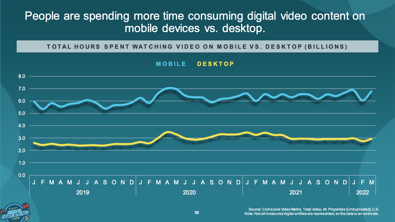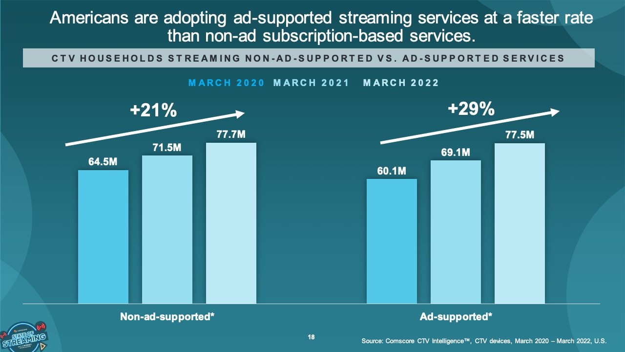 79% 的具备 Wi-Fi 的家庭在 CTV 设备上观看流媒体内容,这样的家庭每月观看流媒体的时间约 122 小时,比 2021 年 3 月增长了 19%。Netflix 的每月观看时间最多,为 43 小时,紧随其后的是 39 小时的 YouTube 和 33 小时的 Hulu。