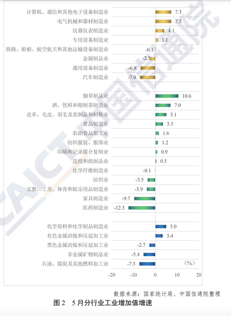 六成以上行业正增长,装备制造业回升明显。5 月份,41 个大类行业中有 25 个行业增加值实现同比增长,较4 月增加7 个;有33个行业增速比上月回升,占比达 80.5%。装备制造业增速明显回升。5月份,装备制造业增加值同比增长 1.1%,较4 月大幅回升9.2 个百分点。其中,汽车制造业、仪器仪表制造业、通用设备制造业增速分别较上月回升了 24.8 个、12.9 个和 9 个百分点。多数消费品制造业有所恢复。烟草制品业,酒、饮料和精制茶制造业,皮革、毛皮、羽毛及其制品和制鞋业,食品制造业增长较快,分别增长10.6%、7.0%、3.5%和 5.1%;医药制造业和纺织业分别下降12.3%和3.5%,较上月回落 8.5 个和 0.9 个百分点。原材料工业增速有所分化。有色金属冶炼和压延加工业及化学原料和化学制品制造业实现正增长,分别增长3.4%和 5%;黑色金属冶炼和压延加工业,非金属矿物制品业,石油、煤炭及其他燃料加工业仍为负增长,分别下降2.7%、5.4%和7.3%。