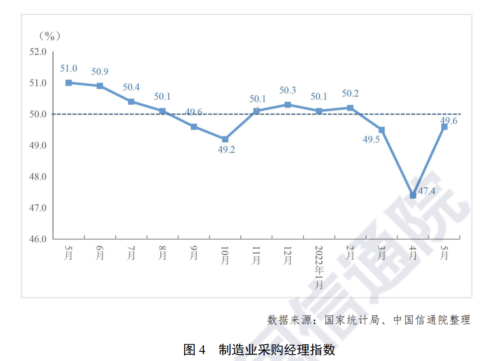 制造业景气水平有所回升。5 月份,制造业采购经理指数为49.6%,较上月回升 2.2 个百分点,虽低于临界点,但制造业总体景气水平较上月有所改善。分企业规模来看,大型企业PMI 为51.0%,高于上月2.9 个百分点,重回扩张区间,其中生产指数和新订单指数分别为52.5%和 50.7%,高于制造业总体 2.8 和2.5 个百分点,大型企业产需好于制造业总体;中、小型企业 PMI 分别为49.4%和46.7%,高于上月 1.9 和 1.1 个百分点,景气水平虽有所改善,但仍低于临界点。