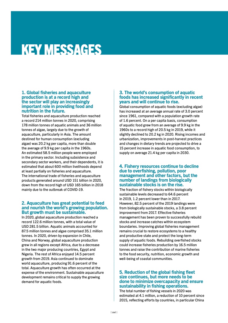 当前水产食品对粮食安全和营养的贡献之大前所未有。自1961年以来,全球水产食品(不包括藻类)的消费量以年均3.0%的速度增长,几乎是世界人口年均增速的两倍。人均年消费量达到20.2公斤,是20世纪60年代消费量的两倍多。