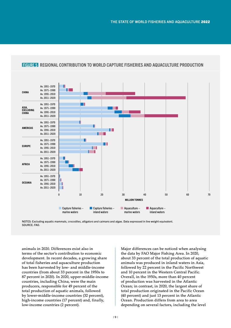 2020年,亚洲国家渔业和水产养殖业的水生动物产量占全球总量的70%,其次是美洲、欧洲、非洲和大洋洲。中国仍然是最大的渔业生产国,其次是印度尼西亚、秘鲁、俄罗斯、美国、印度和越南。