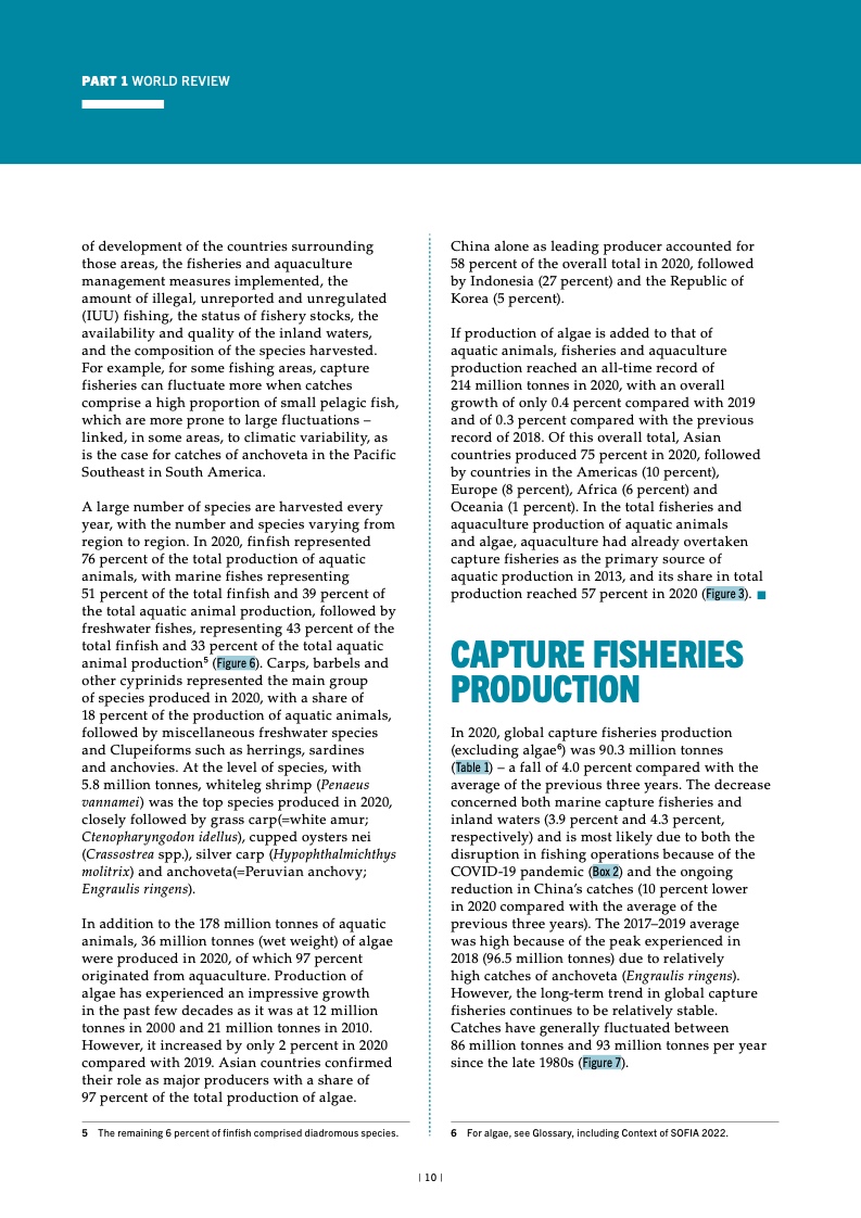 造成捕捞渔业产量下降的主要原因包括新冠疫情严重阻碍了捕捞活动、市场准入和销售,中国的渔获量减少,以及秘鲁鳀因自然波动而出现的渔获量减少。