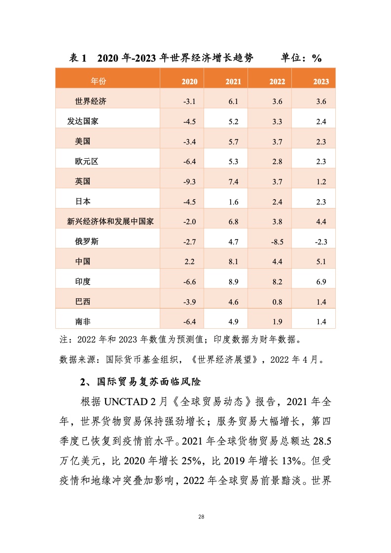 报告回顾了2021年及2022年以来中国外贸运行情况。指出2021年中国对外贸易规模和国际市场份额再上新台阶,实现“十四五”良好开局,为国民经济持续恢复发展作出了积极贡献。2022年以来,中国外贸总体开局平稳,实现持续增长。