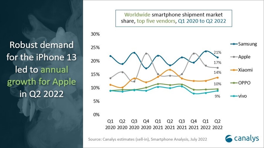 算下来iPhone 13发布已经快1年时间了,虽业内以及消费者的目光已经纷纷投向蓄势待发的iPhone 14系列,可实际上,iPhone 13的畅销风采依然不减。在机构Canalys(科纳仕)最新公布的二季度智能手机统计报告中提到,在全球出货下滑9%的情况下,苹果的份额比去年同期增加了3个百分点,来到17%,机构指出,iPhone 13的需求依然很高。
