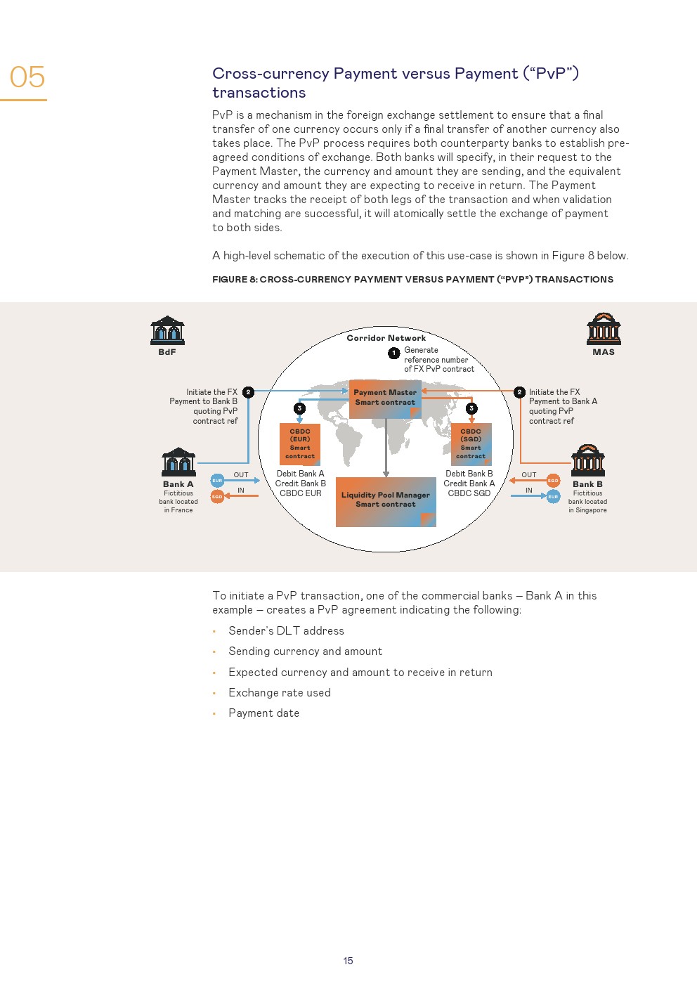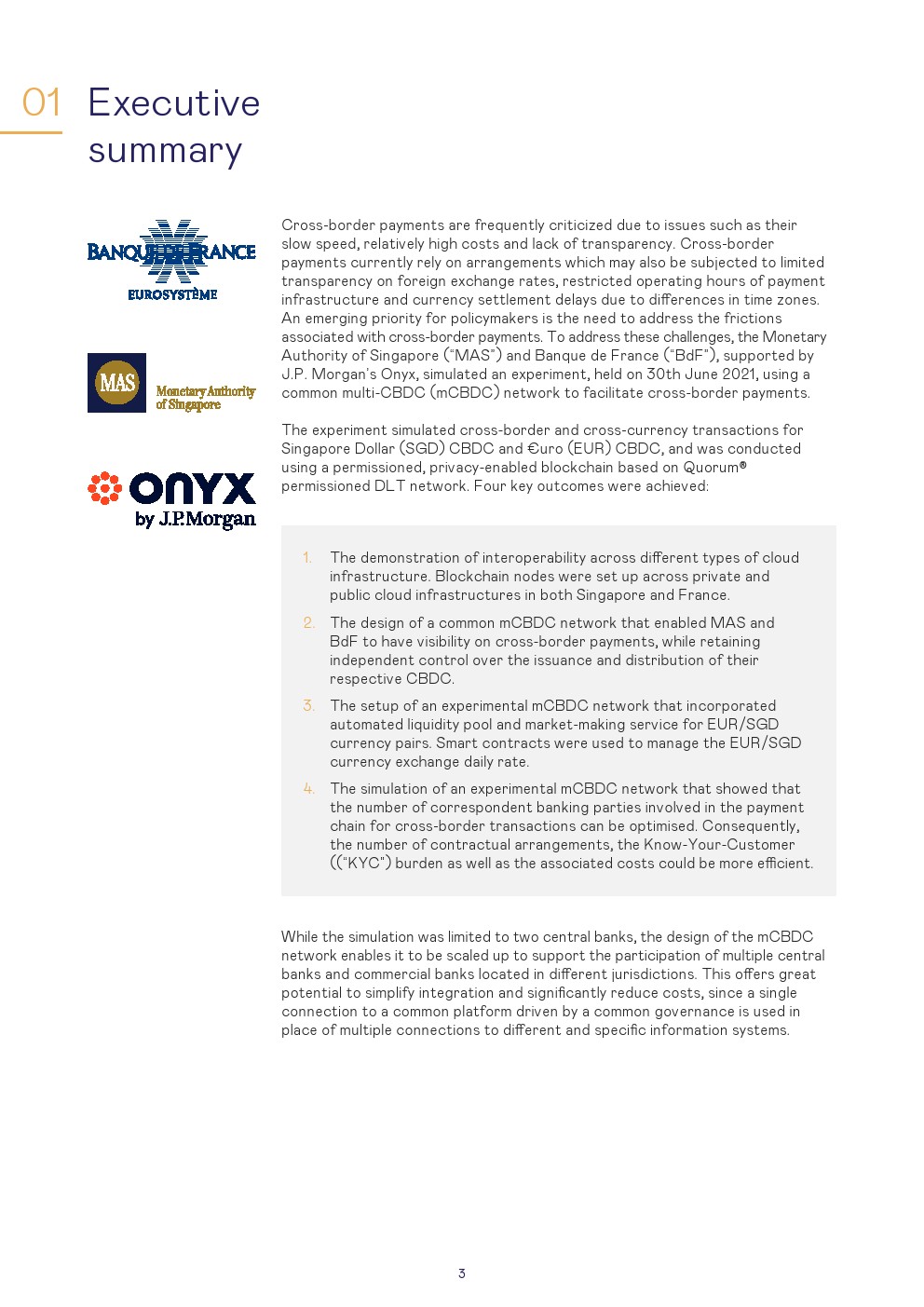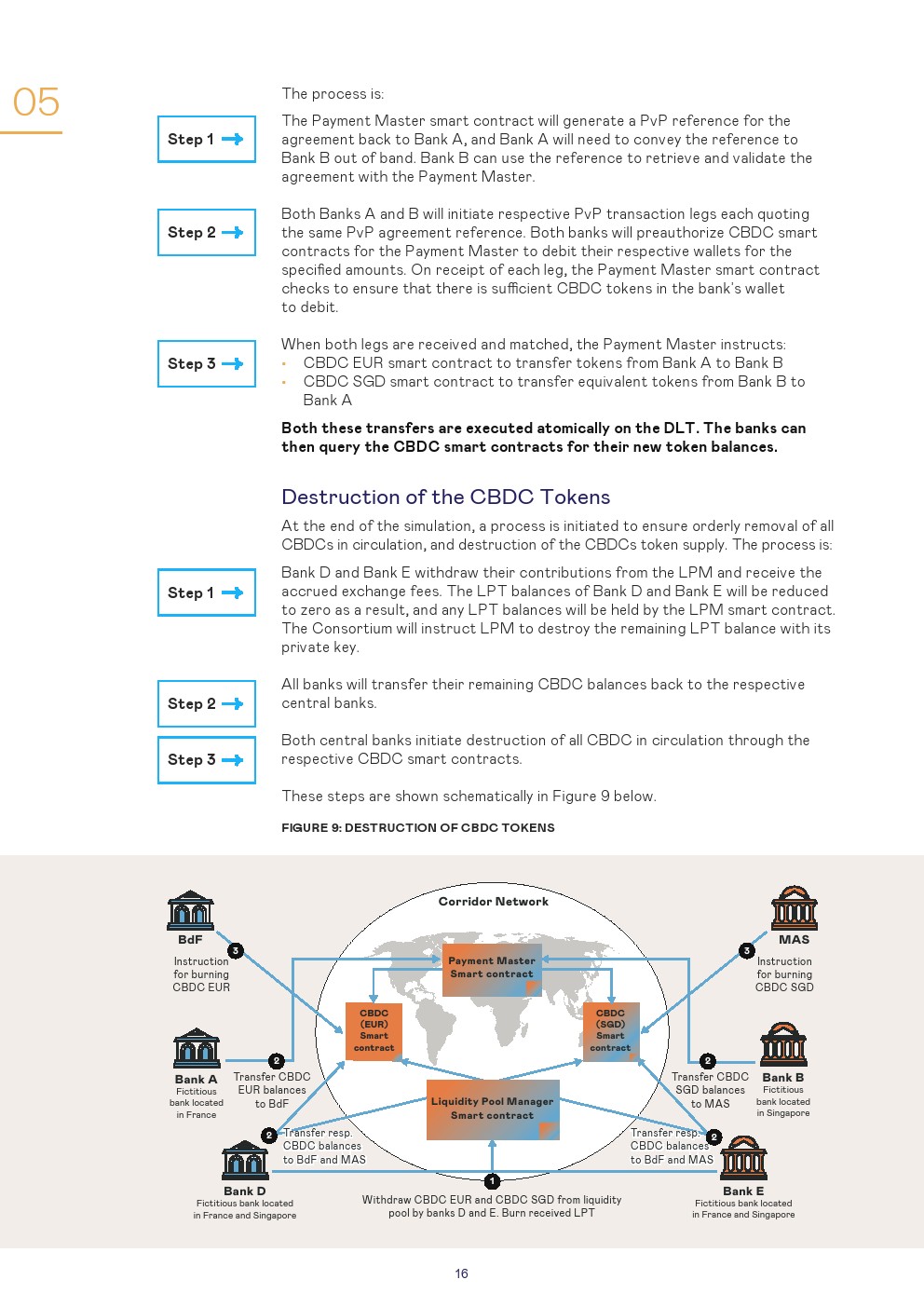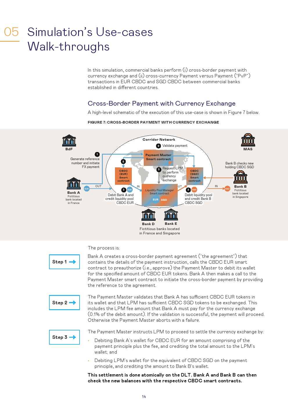 本报告讨论了使用第三种模式进行管理的设置和结果,这是一种技术不可知的安排,其中设置了一个单一的CBDC系统,可以在该系统上交换货币。对于该模拟,商业银行以欧元CBDC和新加坡元CBDC进行:1、跨境支付和2、跨货币支付对支付(PvP)的交易。