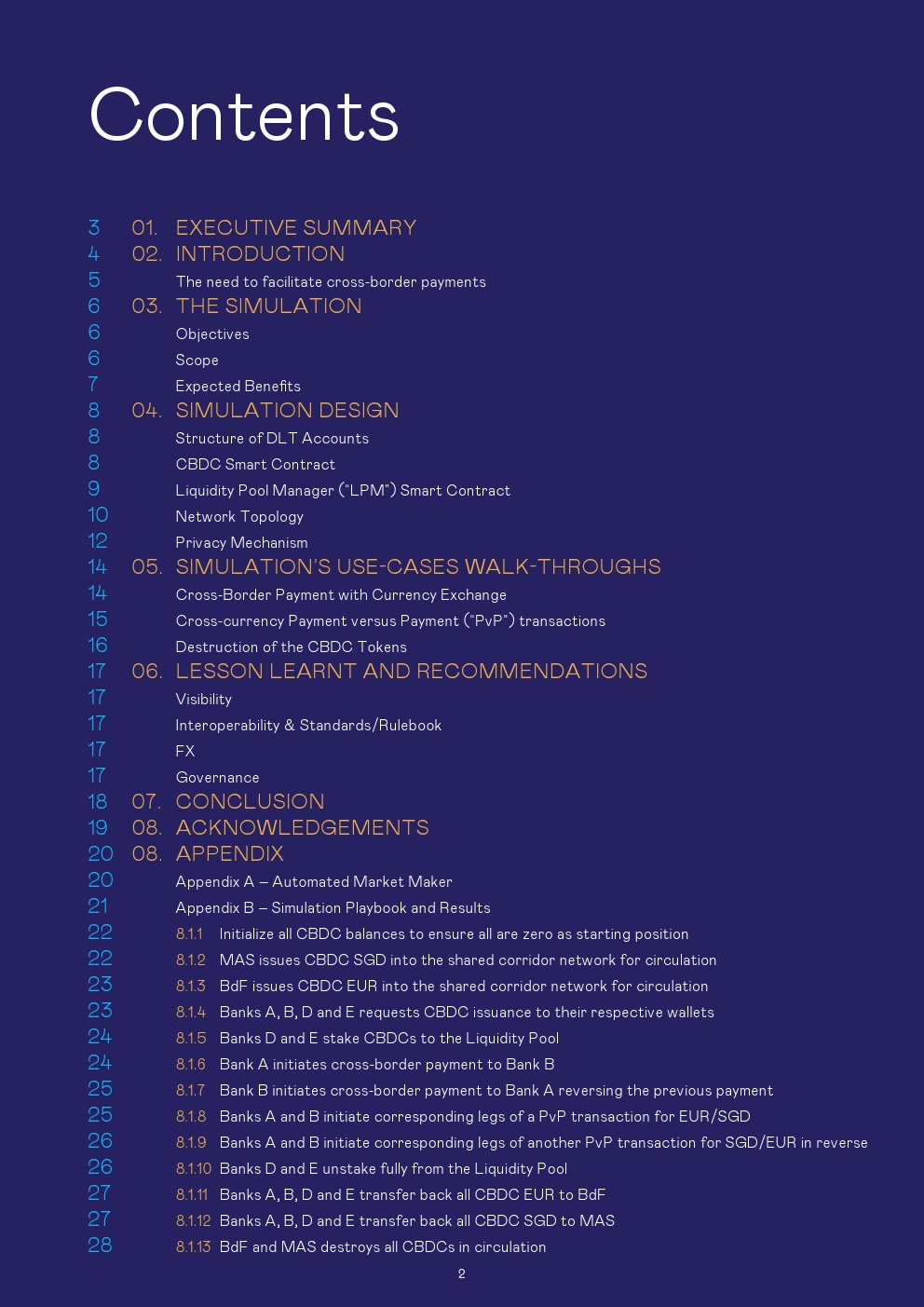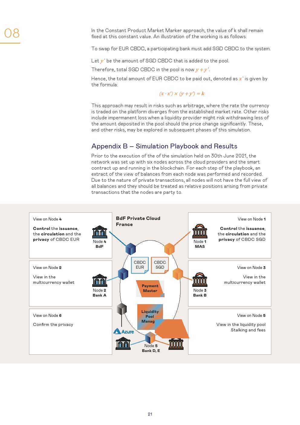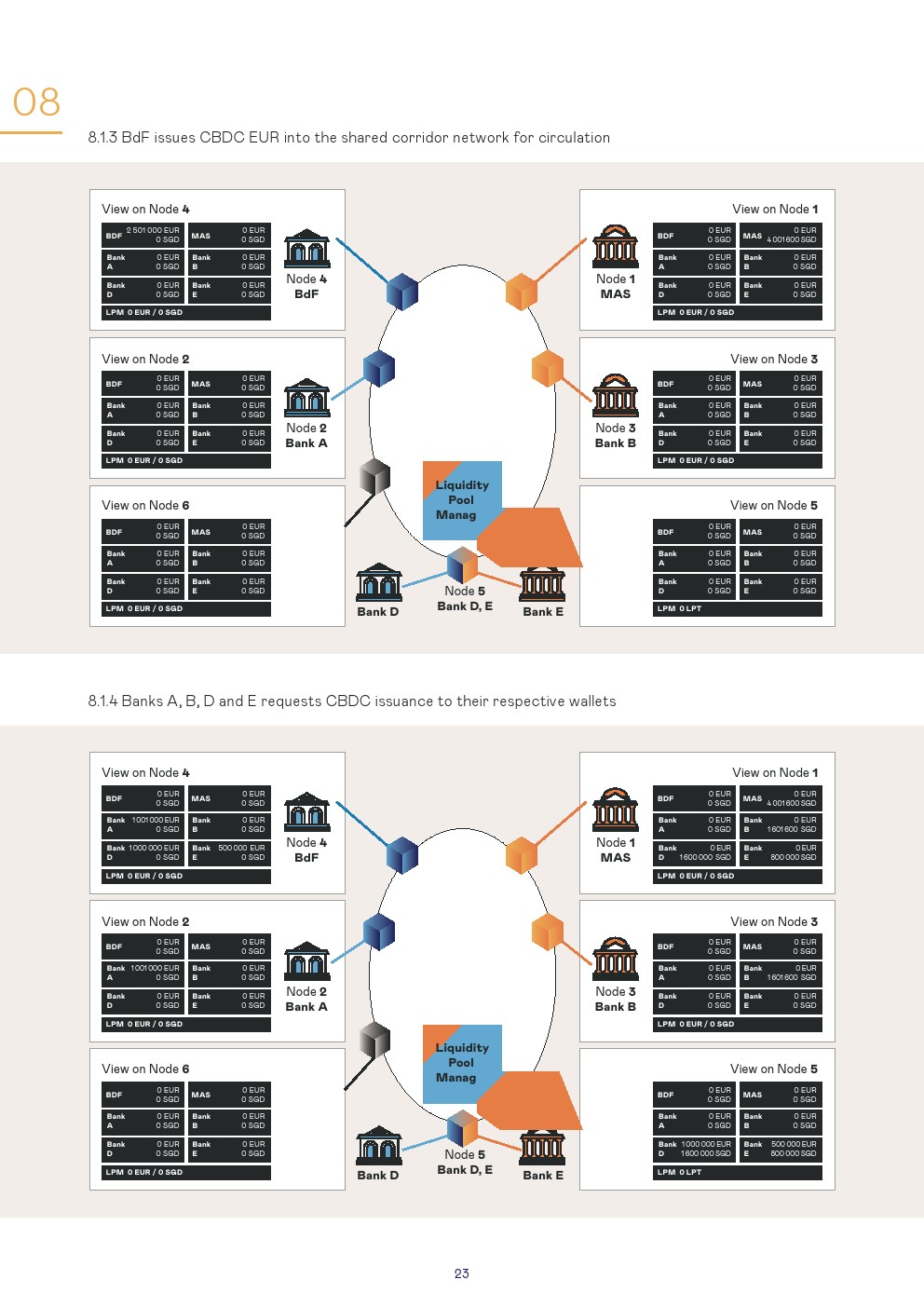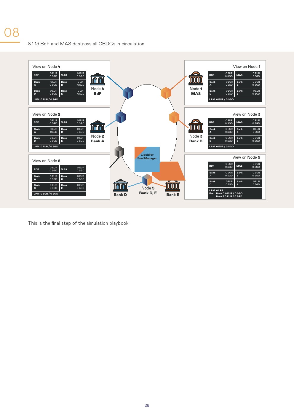 本报告讨论了使用第三种模式进行管理的设置和结果,这是一种技术不可知的安排,其中设置了一个单一的CBDC系统,可以在该系统上交换货币。对于该模拟,商业银行以欧元CBDC和新加坡元CBDC进行:1、跨境支付和2、跨货币支付对支付(PvP)的交易。