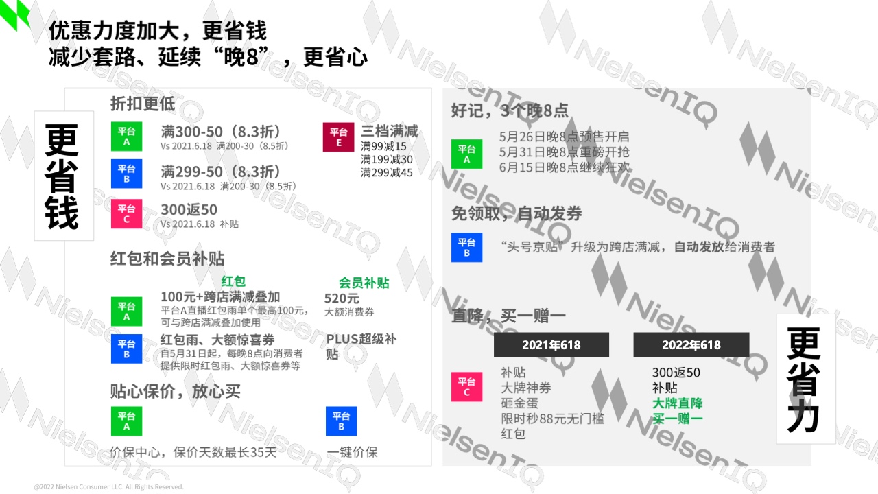 快消品行业多数品类与民生息息相关,是生活中的必需品,也是囤货的首选品类。在当下消费者对后续收入和财务增长缺乏信心之时,平台和品牌、商家也开始重新思考增长逻辑,从“卖得贵”开始转向“卖得多”。从尼尔森IQ监测的数据表现来看,快消品在今年618期间优惠力度加大。从尼尔森IQ监测的品类表现来看,食品品类中,维生素、婴儿食品优惠力度最大,非食品中,漱口水优惠力度最大,其次是婴儿尿布。