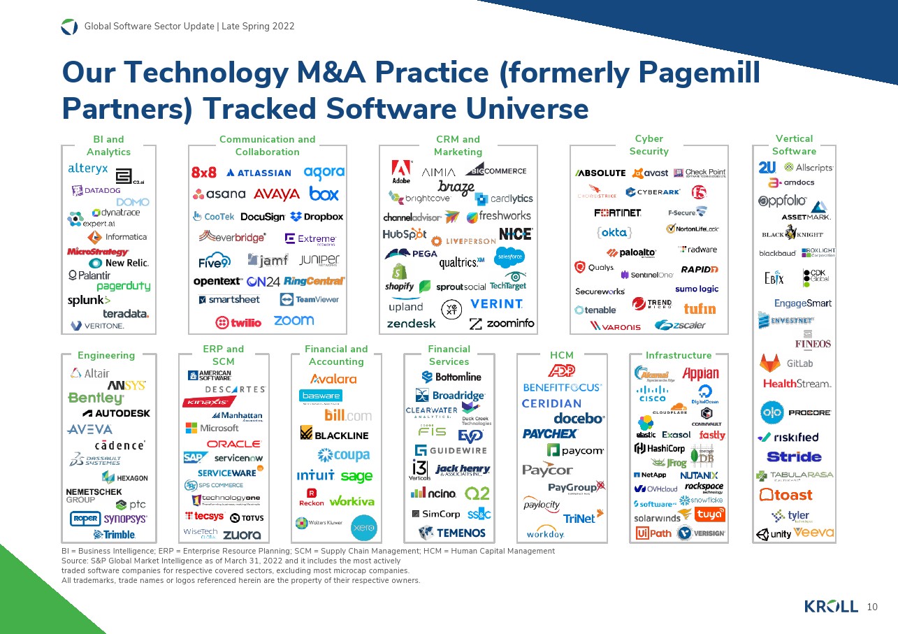 但是,包括持续通胀在内的宏观不利因素导致货币政策收紧,信贷市场出现重大动荡。近期盈利能力有限或为负的公开交易的高增长使SaaS股票受到的打击尤其严重,因为未来现金流的折现幅度更大,平均估值回到或在某些情况下低于大流行前的水平。同时,中端市场对优质软件资产的需求和竞争强度反映在第一季度的并购交易倍数上,该倍数与2021年的水平基本一致,PE交易为6.3倍,战略交易为7.6倍。