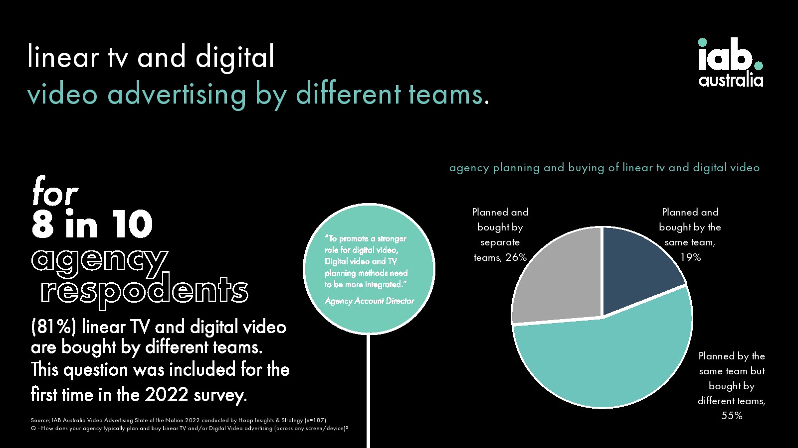 作为数字视频投资的驱动力,扩大电视的覆盖范围已显著增加,它现在是最重要的驱动力,但在跨屏幕购买和测量的集成方面存在挑战。虽然大多数机构都在合作开展传统电视和数字视频广告,但对于8/10的代理机构来说,传统电视和数字视频媒体是由不同的团队购买的。