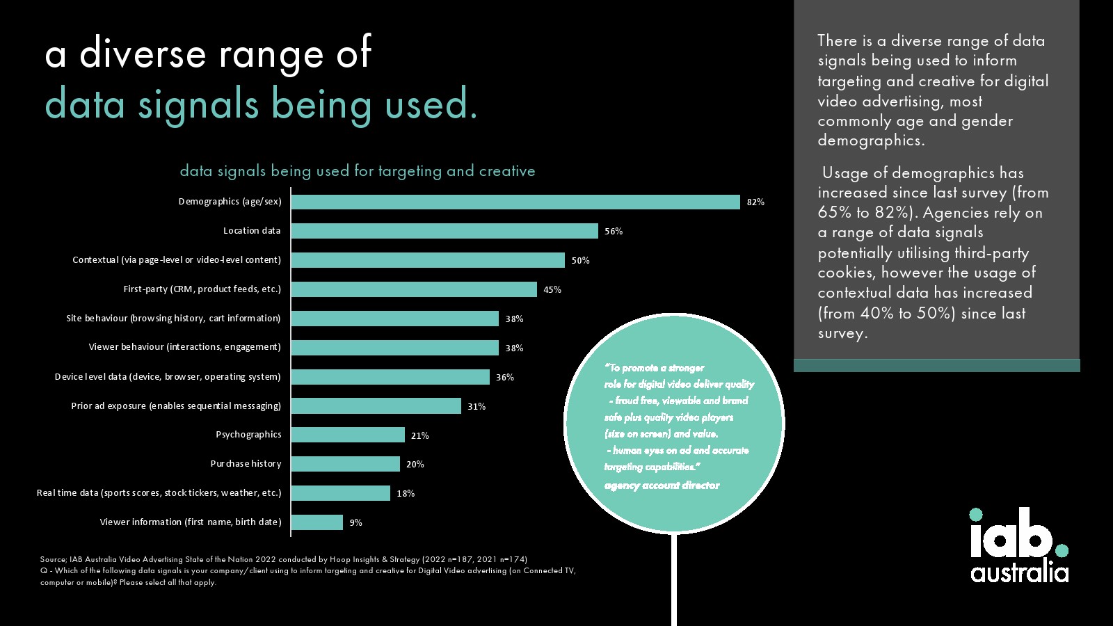 机构依赖于各种各样的数据信号。其中一些定向选项可能会使用第三方 cookie,并且有很大比例的代理商和营销人员尚未采取基于人的营销措施,但是上下文数据的使用已经增加(从40%到50%)。