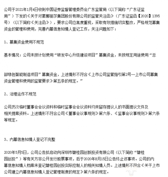 值得一提的是,去年,蒙娜丽莎因存在募集资金使用不规范、治理运作不规范和内幕信息知情人登记不完整问题收到中国证券监督管理委员会广东监管局关注函。