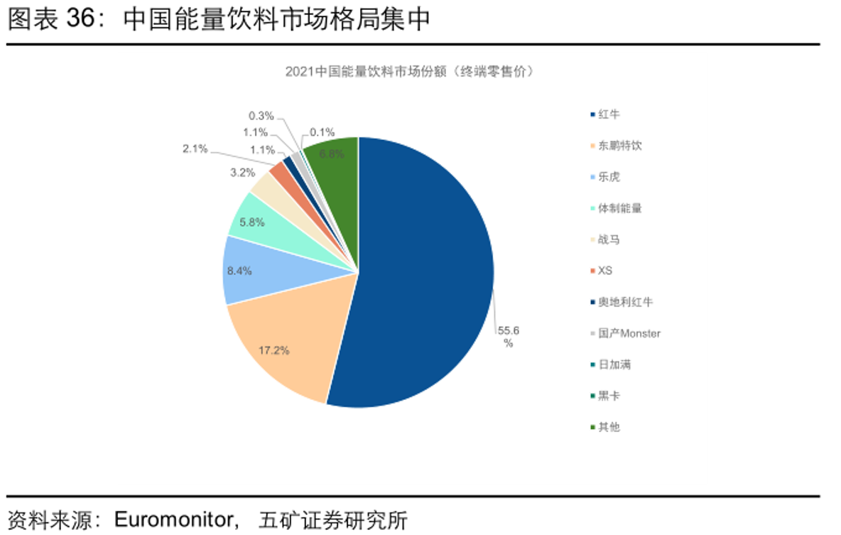 从体量上看,中国能量饮料市场竞争格局可谓一超多强。根据欧睿数据,2020年中国能量饮料市占率超过1%的共有6个品牌,其中红牛的体量遥遥领先,占据一半多的市场份额,其余5家企业分别是东鹏饮料、乐虎、体质能量、战马和 XS,行业集中度较高。
