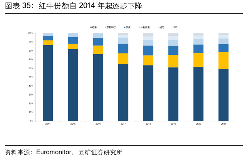 尽管如此,红牛自2016年陷入商标纠纷,对业务发展影响不小。在激烈的市场竞争中,以东鹏饮料(605499.SH)、乐虎为代表的公司,抓住时机抢占市场份额,推出高性价比的能量饮料产品,内忧外患下红牛的市场份额逐步下降。根据五矿证券数据,红牛的市场份额由2014年的超80%下降至2021年的55.6%。