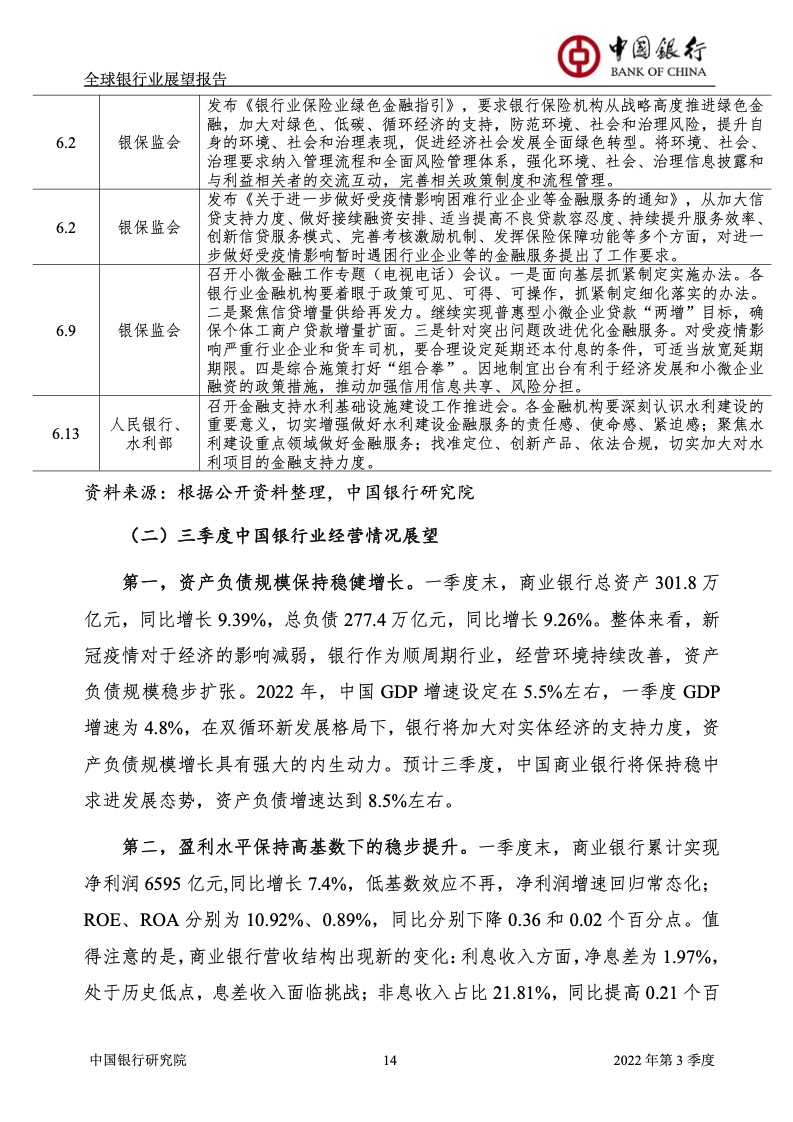 《报告》认为,2022年三季度,全球经济增速下滑,银行业经营环境的不确定性有所上升,规模扩张速度保持平稳,盈利出现分化,可能面临新的风险;中国宏观经济总体向好态势不改,银行业经营稳健,规模持续增长,盈利水平保持高基数下的稳步提升,资产质量良好。