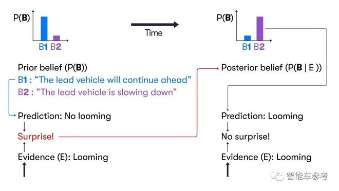 图中下半部分,司机原以为前车要继续前行,然而事实是前车突然刹车,这就与他的心理预期不相符合,认知也就出现了迭代更新。