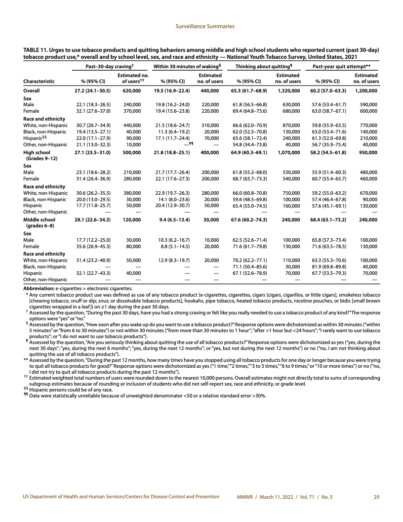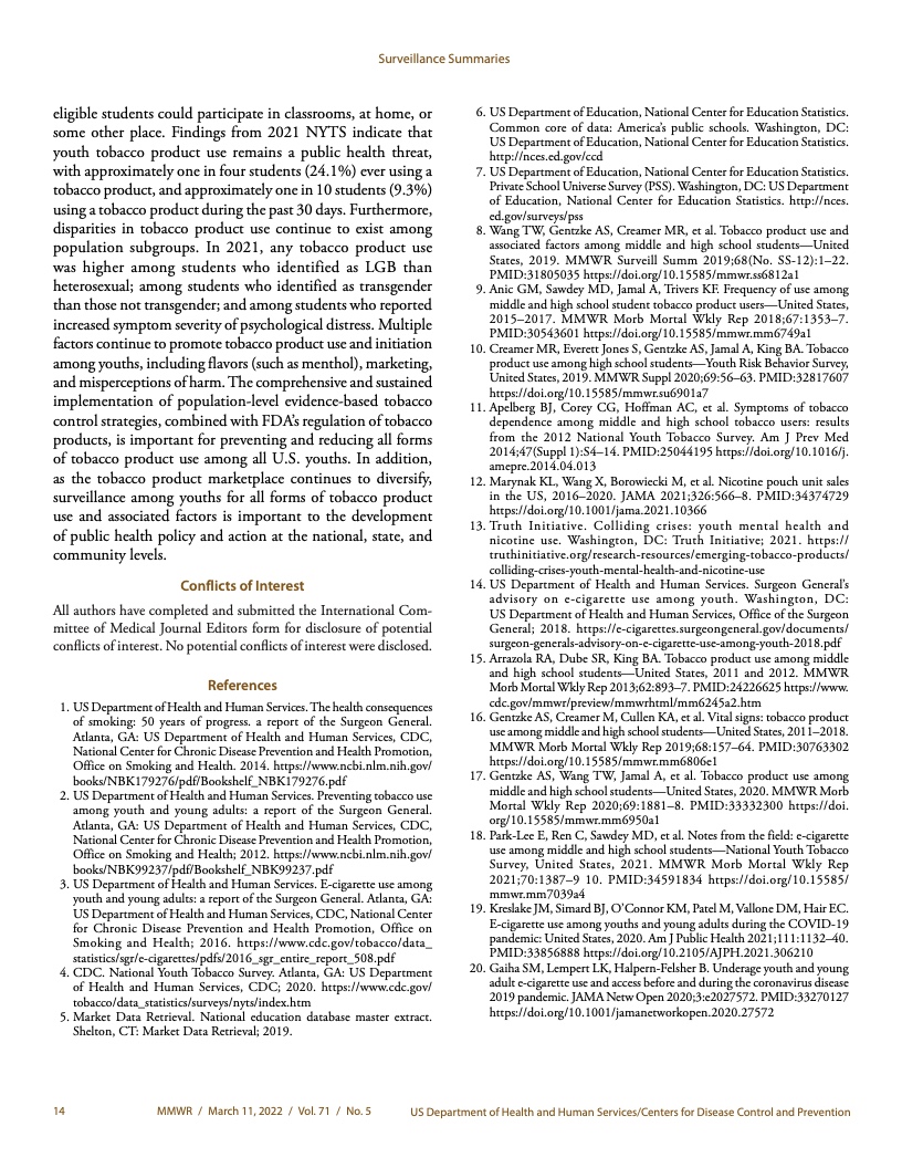 美国食品药物监管局(FDA)与疾病控制预防中心(CDC)联合发布2022 年美国青少年烟草调查报告。根据NYTS,2022 年美国青少年群体中的电子烟用户为255 万人;2019年,19.6% 的中学生在过去 30 天内至少吸过一次电子烟,2022 年的总体数字为9.4%,其中高中生群体中电子烟用户数量占比14.1%,初中生群体中电子烟用户数量占比3.3%。