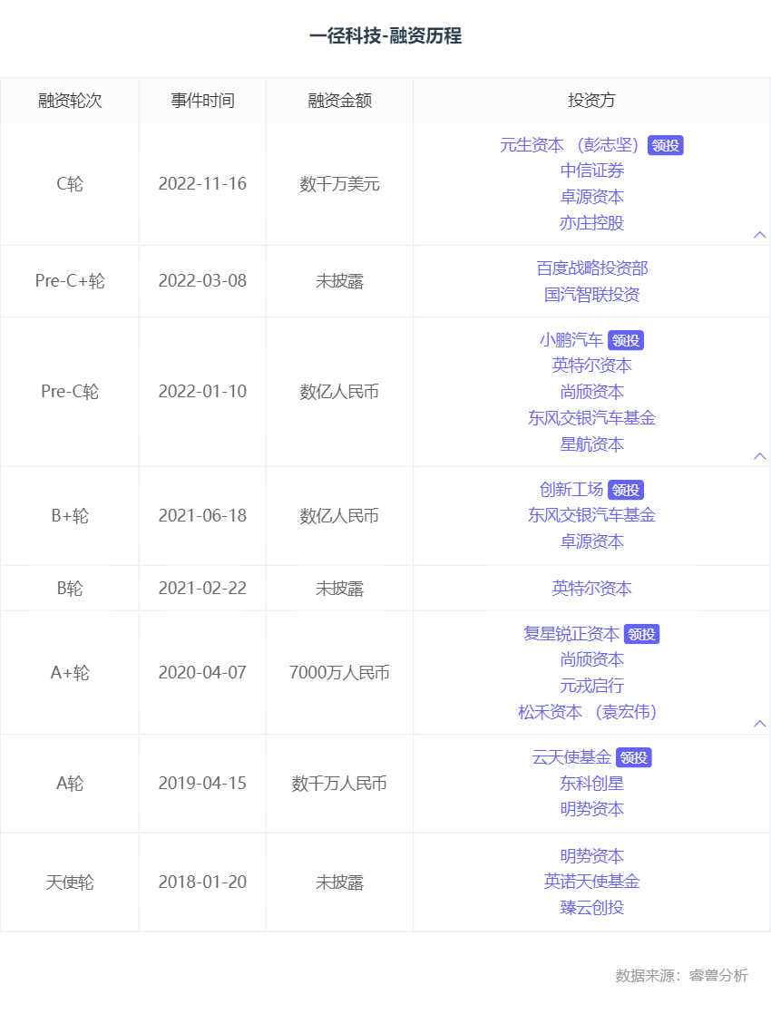 近日,车规级MEMS激光雷达解决方案提供商一径科技,完成数千万元美金C轮融资,由元生资本领投,中信证券投资、卓源资本、亦庄资本跟投。结合之前百度,小鹏汽车战略出资发起的星航资本,上汽旗下尚颀资本,东风汽车旗下东风交银产业基金,国汽投资,以及老股东Intel Capital和创新工场共同投资的PreC轮,共募集了近亿美元资金。C轮融资将用于一径科技长短距全系列车规级前装量产激光雷达产品的迭代,加快核心芯片自研进度,扩充产能,以及推动车规级MEMS激光雷达解决方案的研发和商业化进程。