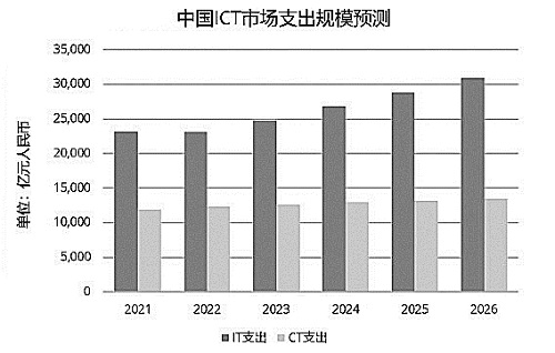 未来五年中国ICT市场仍将保持快速增长。2022年,新冠疫情持续肆虐,企业的生产和经营活动受到影响,中国的IT支出维持在与2021年基本相当的水平。预计2023年中国经济将出现反弹,数字经济将会持续发展,ICT市场恢复增长并保持较高的增速。预计未来几年,半导体、人工智能、网络安全、新能源、智能汽车、生物制药、机器人等新技术和新产业领域将会加速发展,数字政府、智慧医院、工业物联网、工业软件、网络银行等新的业务模式将呈现持续创新和高速发展的态势,促进ICT市场规模增长。IDC预计,2022—2026年中国ICT支出的复合增长率将达到5.7%,而IT支出的复合增长率将达到7.5%。