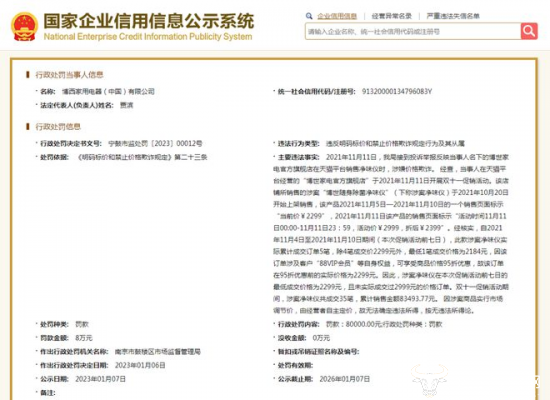 2023年1月6日,南京市鼓楼区市场监督管理局调查发现,博世家电的一款产品存在违反明码标价和禁止价格欺诈规定行为,给予博西家电8万元罚款的行政处罚,引发关注。