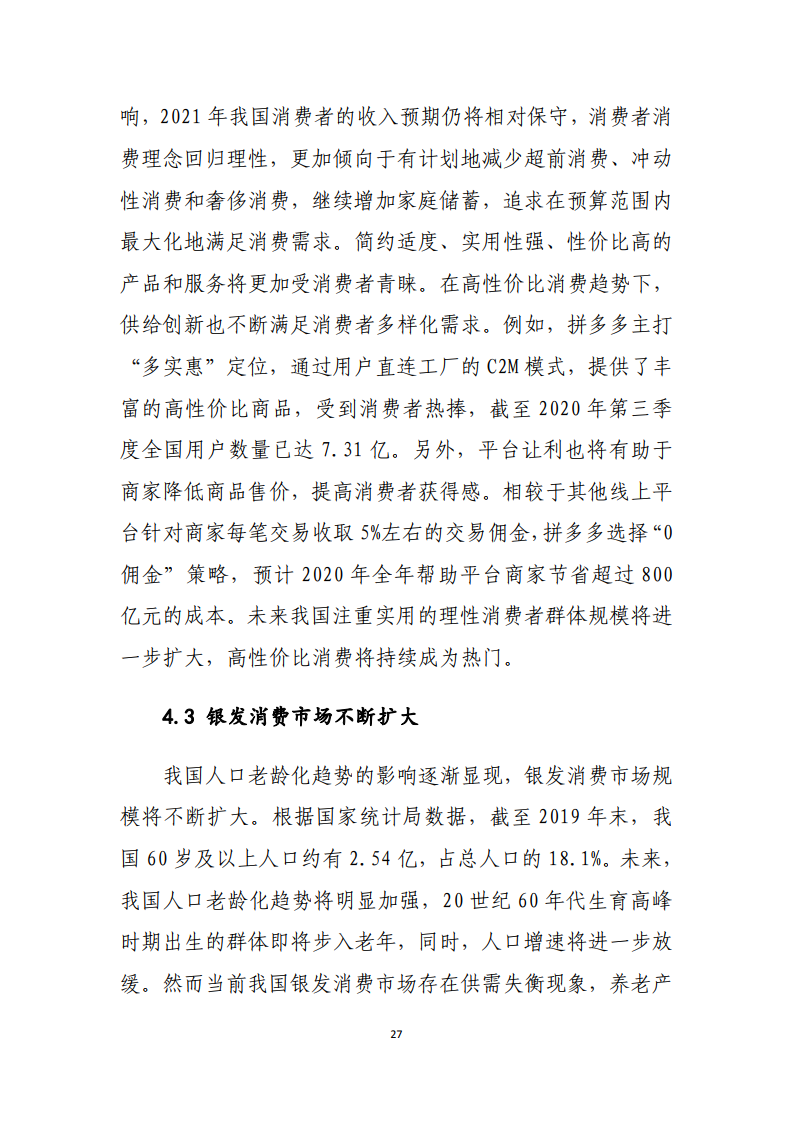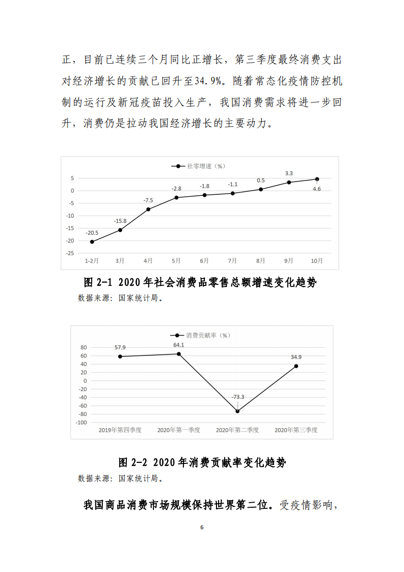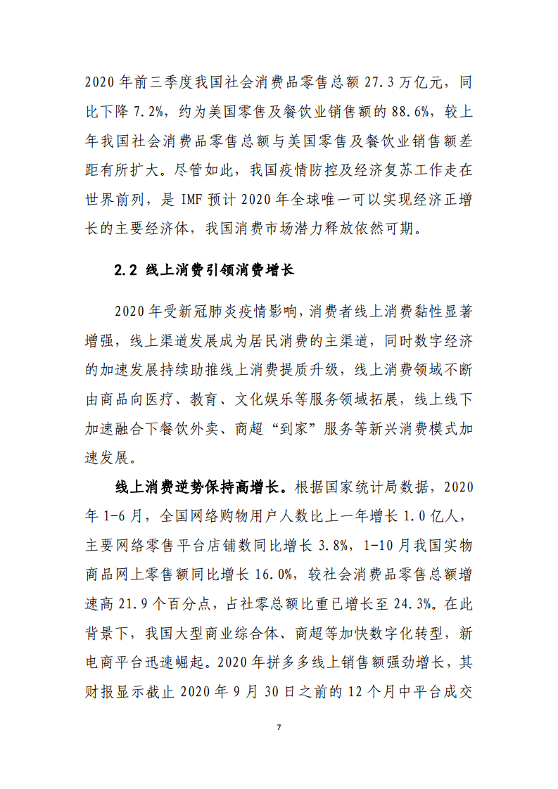《报告》分析受疫情影响,2020年前三季度我国社会消费品零售总额27.3万亿元,同比下降7.2%,约为美国零售及餐饮业销售额的88.6%,较上年我国社会消费品零售总额与美国零售及餐饮业销售额差距有所扩大。尽管如此,我国疫情防控及经济复苏工作走在世界前列,是IMF预计2020年全球唯一可以实现经济正增长的主要经济体,我国消费市场潜力释放依然可期。